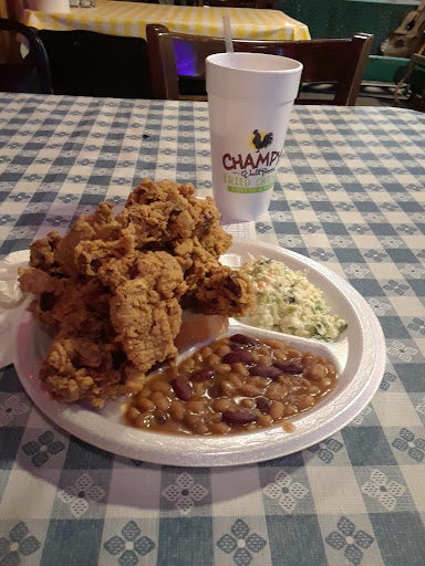 Read moreSeating myself as the sign stated, I waited for a waitress to attend my table. And waited...Then one shows up for the two gentleman beside me but ignored my presence. I'm guessing I wasn't one of her tables to wait on so I finally stood up and went to ask one of them to wait my table. Finally a waitress comes by to give me a menu, take my order, very nice young lady. She returns, I ordered the chicken liver plate with slaw and baked beans and sweet tea. The food arrives but no sauce to dip the livers in so I ordered some Champys sauce. I waited...waited...really? So I ordered it again and it finally showed up. The food: Fried chicken liver plate for $9.75 was an ample serving, good with the sauce. The sauce was good, not spicy or hot. The sweet tea was $2.95 and good tea. The plate came with coleslaw which was average and baked beans which were average but good. I ordered the strawberry cake for dessert without looking at the menu. Big mistake! Champys thinks alot of there strawberry cake! For $6.99 a slice! Really!? Not ever again. So my total bill for one person was $21.51. Pretty high for fried chicken livers, a small serving of slaw and beans, sweet tea( a Southern staple), and an overpriced slice of cake. The decor is interesting and entertaining to look at as it's strung with colorful lights and memoribilia everywhere. The service was very poor in my opinion and restaurant service should be excellent if you expect customers to return. Must have plenty of business I assume. They obviously don't need any new business. The bill I thought was overpriced. Probably...