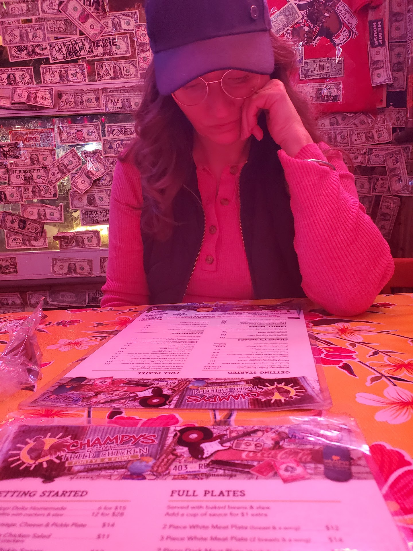 Read moreWe were given recommendations to try this spot. Seems like a highlighted and very well liked place that keeps a crowd, whether dining inside or their outside patio area and or pick up to go. There's dollar bills plastered everywhere, I'm sure there's history but some of them had fuzz on them. I'm guessing dust fuzz. Anyway they were entertaining to look at while we waited for our food. I wanted catfish initially but then I thought I'm at a chicken spot so I better order what they are known for. Our apps were fried green tomatoes and they were absolutely delicious. We waited awhile for our food to come as well. I had the 2pc white and hubby had 3pc dark and our son had tenders with Mac n cheese. My wing and hubby leg were extra small. The chicken had way too much breading for me and fried crunchy hard. I couldn't taste the spice but son was fanning his tongue and hubby agreed it was a little spicy. Wish they warned us as we didn't expect that. The mac n cheese was tasteful and great for a kid option as the noodles were spiral elbows. They do have them overly saturated in cheese sauce though. We didn't eat much all around and I decided to take back to the hotel. So glad I did because we saw a homeless man and I asked if he was hungry and he said he was and I happily gave him a container full of chicken and a few...