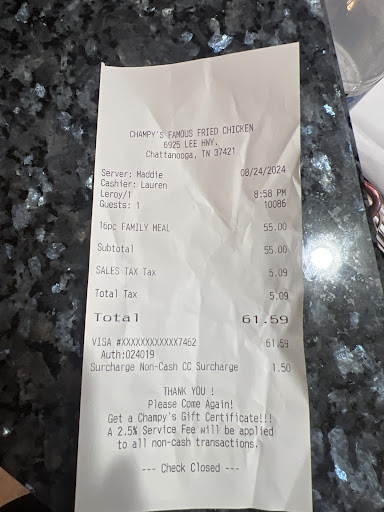 Read moreSeating myself as the sign stated, I waited for a waitress to attend my table. And waited...Then one shows up for the two gentleman beside me but ignored my presence. I'm guessing I wasn't one of her tables to wait on so I finally stood up and went to ask one of them to wait my table. Finally a waitress comes by to give me a menu, take my order, very nice young lady. She returns, I ordered the chicken liver plate with slaw and baked beans and sweet tea. The food arrives but no sauce to dip the livers in so I ordered some Champys sauce. I waited...waited...really? So I ordered it again and it finally showed up. The food: Fried chicken liver plate for $9.75 was an ample serving, good with the sauce. The sauce was good, not spicy or hot. The sweet tea was $2.95 and good tea. The plate came with coleslaw which was average and baked beans which were average but good. I ordered the strawberry cake for dessert without looking at the menu. Big mistake! Champys thinks alot of there strawberry cake! For $6.99 a slice! Really!? Not ever again. So my total bill for one person was $21.51. Pretty high for fried chicken livers, a small serving of slaw and beans, sweet tea( a Southern staple), and an overpriced slice of cake. The decor is interesting and entertaining to look at as it's strung with colorful lights and memoribilia everywhere. The service was very poor in my opinion and restaurant service should be excellent if you expect customers to return. Must have plenty of business I assume. They obviously don't need any new business. The bill I thought was overpriced. Probably...