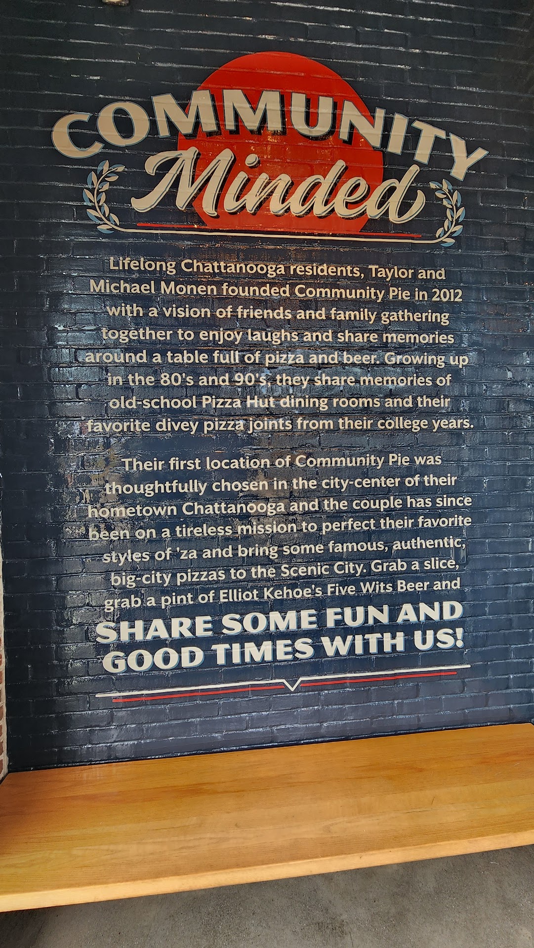 This is certainly a cool place 😎 for families 👪 as well, besides couples. While you guys are out enjoying the restaurant, please be aware of the surroundings. There are other outstanding restaurants in the area also. However this Five-Star 🌟 Review is about Community Pie. You guys have hit the jackpot for things to do. Got it ! Mr. C. I am the outstanding tour guide in our Beautiful Scenic City. I am here, and will assist you as your guide. Please go check out my other places to stay, play, and eat. You guys are hungry 😋 ? Let's eat some delicious food. I Highly recommend the Detroit- Style Super Supreme Large. You want pizza right ? However if you want Something different try the Drunk Pig NY Pizza 🍕. If you want a to try a Meatball Appetizer this will certainly work. If you are Vegan try the creative Hot Mess with Vegan Pepperoni. You will love it ! Furthermore throw in a Greek Salad 🥗. You are good to go. If you really want to go all out try their Famous Chicken, and, delicious waffles. This is a popular dish 😋. Speaking of popular 👌. It's restaurants like Community Pie, that has made our Scenic City One of the BEST Tourists Attractions in the World 🌎.We are a Great City to stay, play, and eat. Community Pie serves up your choices of drinks 🍸 as well to wash down your delicious food 😋. Once you are finished eating go walk 🚶♀️ the mall. You are in walking distance of our largest mall. Hamilton Place Mall. Like shopping 🛍 ? Like movies ? it's right across the parking lot from you guys. There are are other entertainment venues in the area as well. Like dancing 🕺? Like socializing ? Like parks ? for a nice evening Scenic View. All of this area has this, and a lot more. Guess what ? You guys are only about 10 miles from the heart of tourism. This of course is our World's Famous Aquarium. Take 75 to 24 for an evening of a lot more to do , and see. However make sure to give a Shout-out to Community Pie for excellent service. So maybe it does take a little longer with service sometimes. Got it ? This is because they stay busy at certain times. This is not a Bad thing. It just shows a lot of customers are keeping it moving. The outstanding, professional, and friendly staff is working extra hard to service you guys . Got it ? Please tip accordingly. They will thank you 😊. You will thank them as well. I love Community Pie at both locations 😋. I Love❤️...
