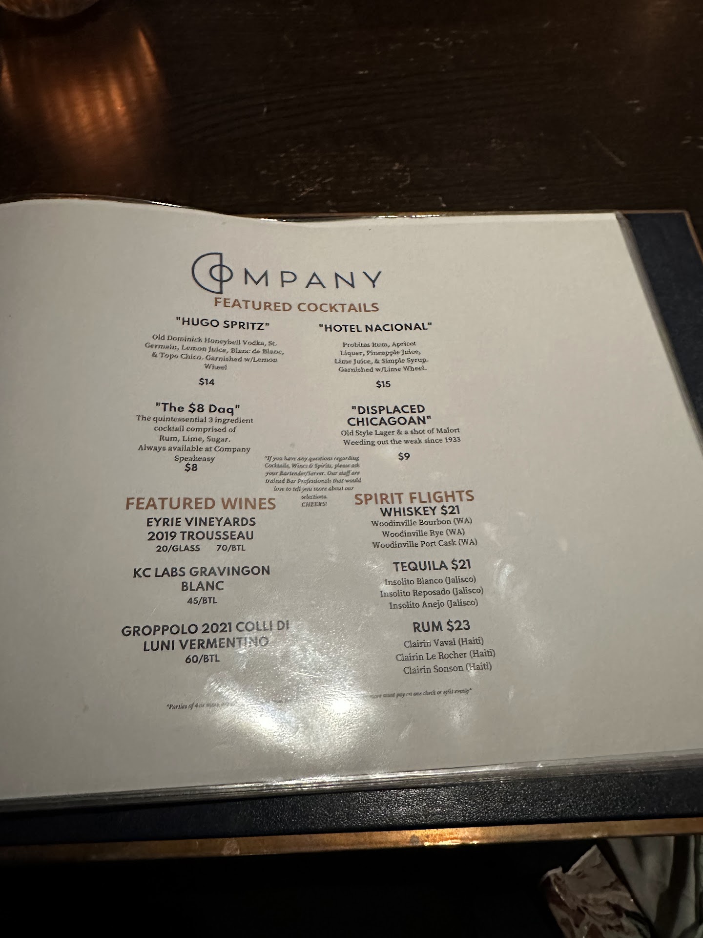 Read moreA recent evening at Company, the speakeasy nestled in the Kinley Hotel in Chattanooga, TN, proved to be an absolute treat. Ensuring a time limit with a two-hour reservation, we slipped into an atmosphere that exuded a timeless, yet chic allure, with a dash of sultry mystery. The delectable aroma of our gourmet dishes wafted through the air, meeting our expectation with every bite. Equally as enticing were the inventive cocktails, mixed to perfection, each sip delivering a new note of complexity. This place certainly elevated our ‘speakeasy’ impression, from the decor to the gastronomy. Whether rendezvousing with friends or rekindling romance on date night, Company seems to offer the perfect backdrop. With their multifaceted approach to dining and a zest for delivering quality, the establishment uniquely transcends the mainstream, making it an essential visit in Chattanooga. All in all, it was a retro-chic affair that left us anticipating our next...