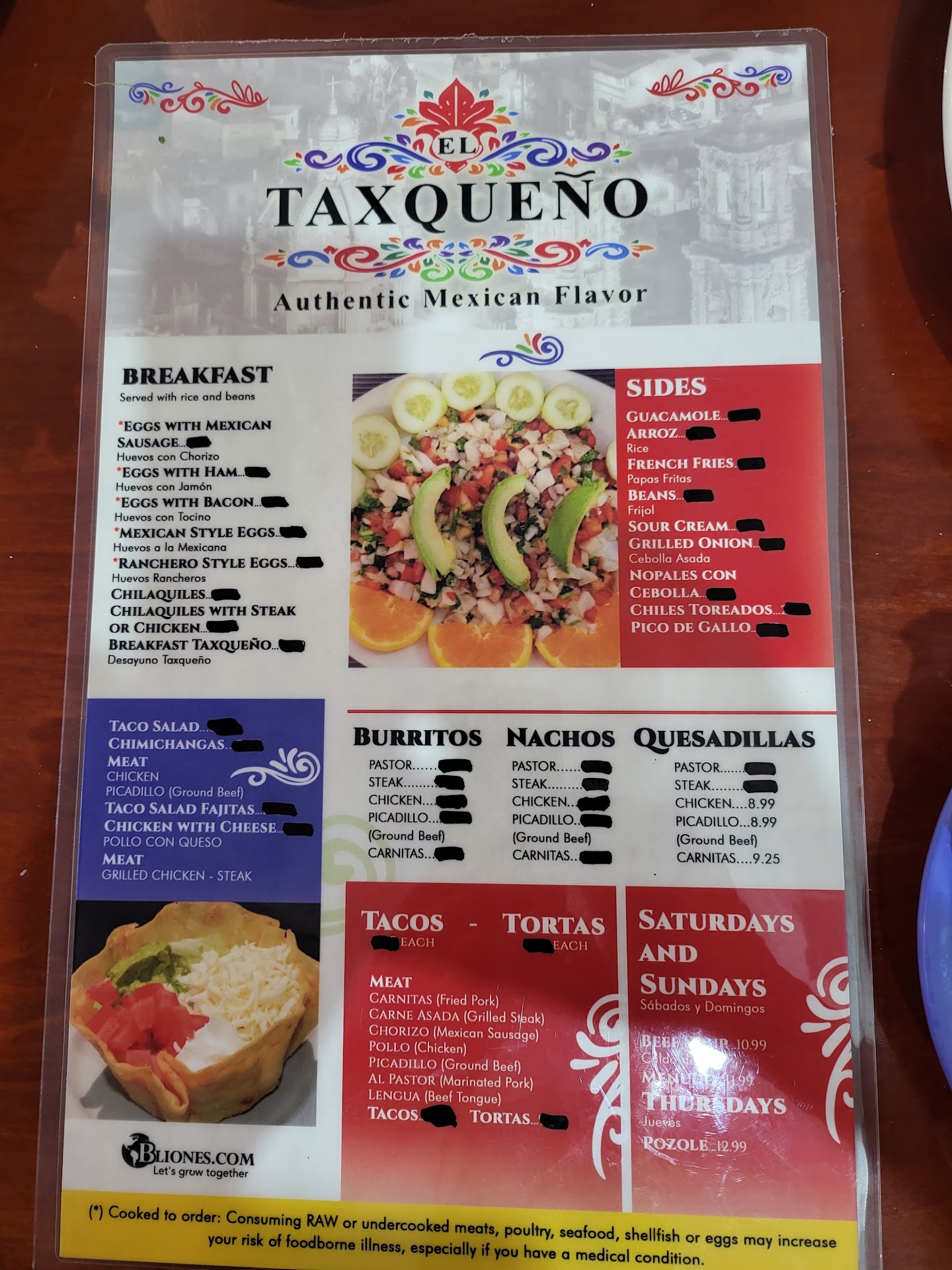 The first thing that caught my attention was the menu. It's clear that El Taxqueno takes pride in serving traditional Mexican dishes made with love and care. The menu offers a wide range of options, from classic favorites like tacos and enchiladas to more unique dishes that showcase the diversity of Mexican cuisine. Whether you're a meat lover or a vegetarian, there is something here to satisfy every palate.