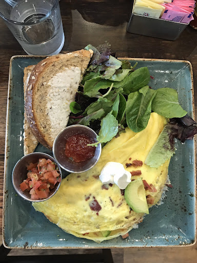 I had the works Omelet. Now understand, I am very picky about my omelet, but the “Works Omelet” was the best restaurant Omelet I have had in years. Maybe 3 or more types of meat including spicy sausage which, if you enjoy spicy food, really set it off. All ingredients were sautéed beforehand (only way to cook an omelet in my opinion). Usual vegetables and cheese was well melted. The dish came with a thick slice of whole grain toast which probably came from a specialty bake shop and upscale fruit spread. All high quality. I was full all day long and I am a big eater, so smaller appetites should think about splitting this dish. I thing the Omelet and Toast was just under $ 12. Entire tab was just over $ 30 for the two of us, $ 36 with tip.