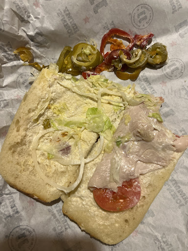 Another order, my wife's sandwich was made with bread that was clearly overcooked. I've never seen it at JJ before, but the bread was dark brown and extremely hard. Mine was fine, but my wife had to throw the bread away because it was too hard to chew. This bread should have been thrown away, and never even come close to making it into an order. This order also took much longer than expected, 15+ minutes, and I again witnessed a staff more interested in conversation than making my food.
