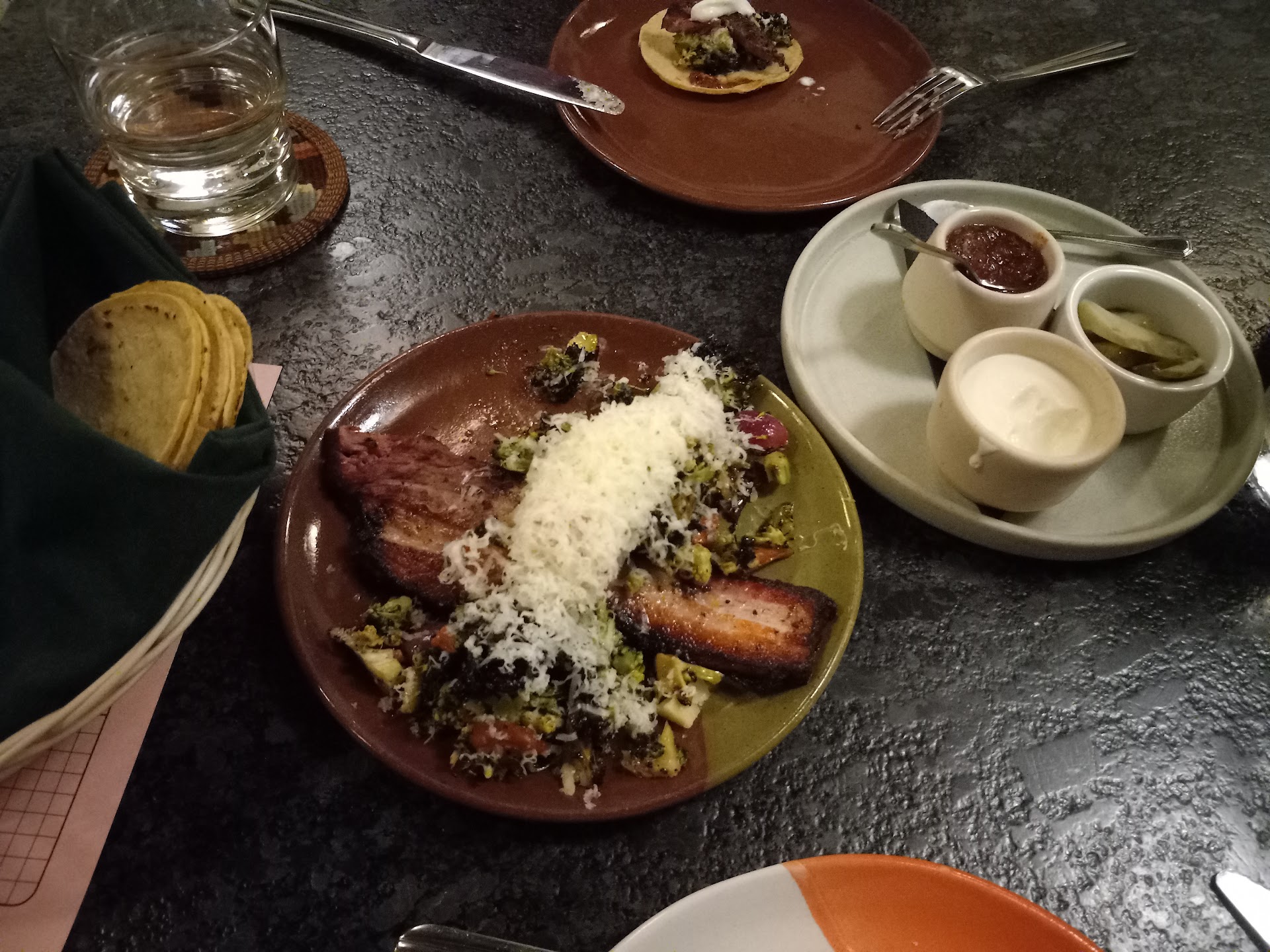 Blueberry mule, Brisket enchiladas, queso, stuffed avacado with carnitas, sweet corn ice cream— the best of the best, and amazing ambiance and bar service. This place is run absolutely flawless and it’s an absolute must for fans of smoked meat and corn tortillas.