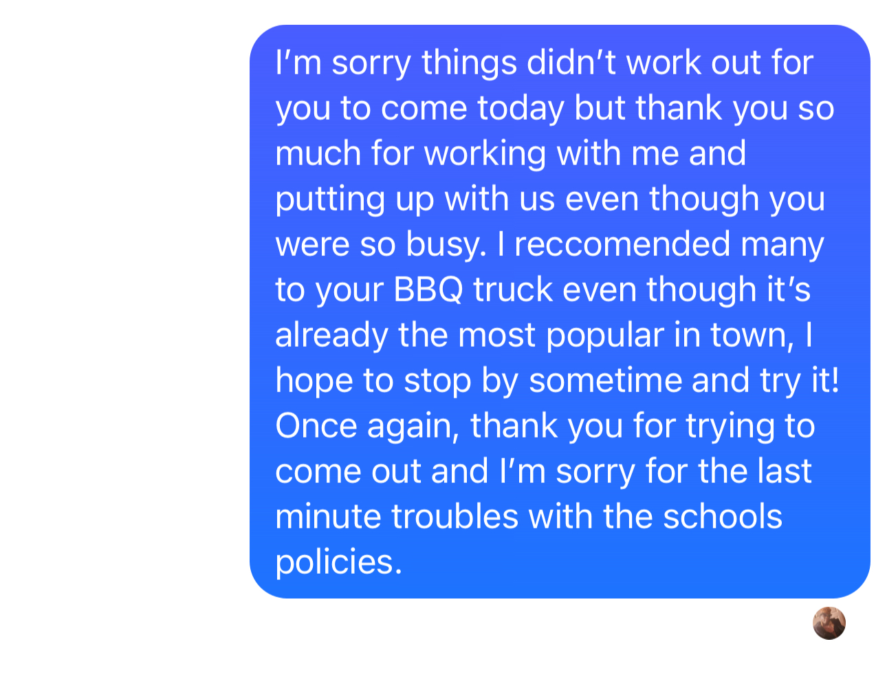 Read moreI do not recommend her to book for a venue or event because she WILL NOT SHOW UP. I posted on Facebook asking to see if a food truck would come out for an event my school hosted and she responded eager to come. But then we were canceled on the day of in a rude tone over the phone because she was too busy, and proceeded to hang up on me. We ended up having to order over 10 pizzas out of pocket for a school sponsored event. The next day I reached out to her to thank her for working with us even though she cancelled, and I didn’t even get an apology or any response back. Very disrespectful and unprofessional for a self-employment business. Hope you guys can find better. Sucks being nice to people like this to get nothing but...