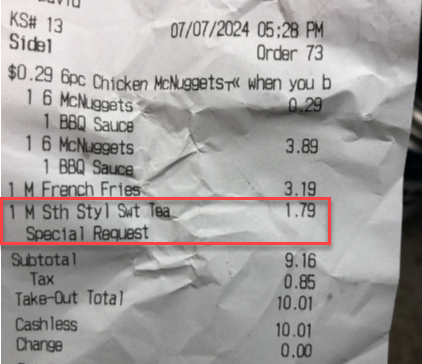 Read moreThis was the worst experience we've had at a McDonald's. Waited in the drive thru over 30 minutes. Placed our order with a girl who said I'm sorry please hold a minute after everything we ordered. Figured they was training so no biggie. She asked me to check the screen to make sure everything was correct. I doubled checked it because we got 3 mighty kids meals and we always get extra fries instead of apple slices. It was correct and said extra fries. We pull around and pay then have to wait about 10 minutes at the window for the food. I pulled across the street to Walmart to pickup my wife who was getting vacation supplies since we were on our way to the Smokies. I start handing out orders to the kids and even though they asked on every order what kind of sauce there was zero in the bags. I pull back across the street to McDonald's and check my receipt which says extra fries, so I walk inside. Manager asked if I was door dash I said no ma'am I didn't get my kids extra fries, and I need 5 BBQ and 1 ranch sauce. She snatches the receipt and gives it a long look, looks back at me and says and just how long ago did you come through here? You can't just come back way later. I said ma'am I just came through your drive thru and had enough time to pull across the street to pickup my wife at Walmart and come back. I said is the time not on the top of the receipt? She didnt even look just turned around got my fries and sauces. The floor behind the counter was destroyed with napkins, food, cardboard. It did look like manager had training issues going on at the same time had about 3 workers who were in the parking lot smoking for much of our wait. One of the other workers asked the manager where somebody was and she got ill and yelled idk they all went to break without telling me and hasn't come back! Still we go to a lot of McDonald's it's the kids favorite and this was unfortunately the worst. The food however did...