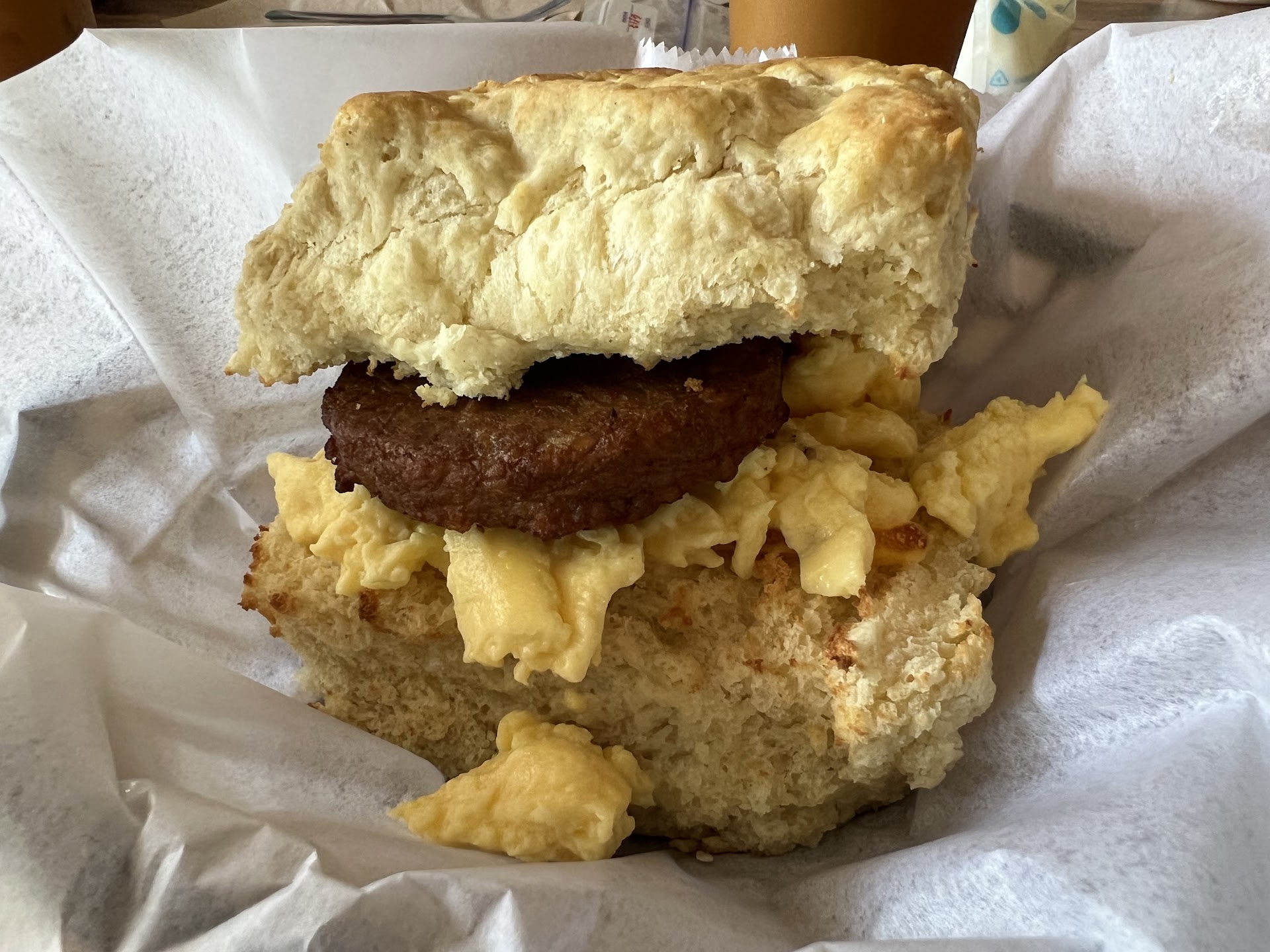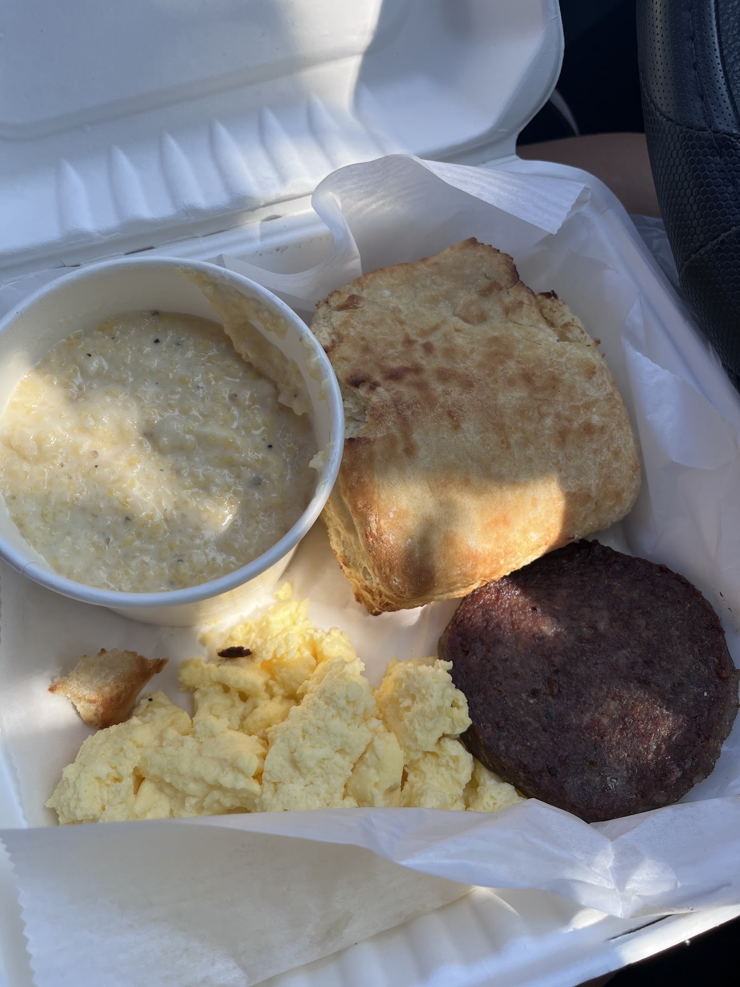 Unimpressed with the service and food. I placed a to go order and the girl who took my order said it would take 15-20 minutes. I come in around 15 minutes after I place the order and I pay for the food and she says it’ll be another 10 minutes. I end up sitting at a table waiting for them to be done. I end up checking in again and a girl said she would check for me and she tells me it’ll be another 10 minute. At this point I have waited 40 minutes for an everything bagel with some eggs and a side of potatoes, and a breakfast combo that included a biscuit, eggs, grits, and a sausage. I check in one more time and the girl seems annoyed that I am asking once again, and I AM ANNOYED at this point. It was steady in the store at this time, but people who have come in after me and placed their coffee and food order while I sat there waiting for my to-go food had gotten all their food and eaten it in the span of me sitting there. Not once did they check in or tell me “hey we forgot your order, we’re working on it.” Or “hey it’s really slammed and the kitchen is backed up.” I would have understood instead of asking so many times. At the 50 minute mark I went up and asked if I could go ahead and get a refund, and the girl that had ignored me and told me to wait “another ten minutes” sees me asking for a refund and basically throws the bag on the counter. I grabbed it and left, just to see they didn’t add the jam nor any ketchup. Potatoes were Luke warm and not very good. Bagel was alright; it’s hard to mess up a bagel. The biscuit was dry. Eggs looked nasty. Would not recommend. Included pictures to show what 50 minutes of waiting for food...