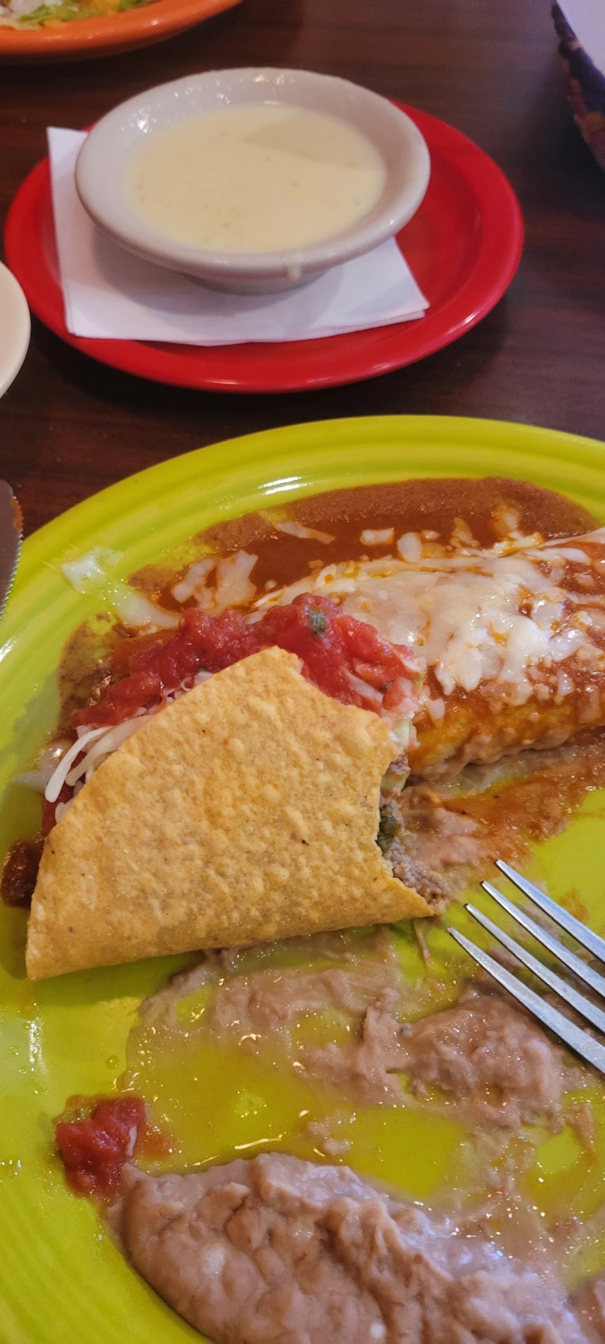 Read moreOk I read all the reviews and I have to say I was not disappointed. The salsa is chunkier than normal fare but seasoned nicely. The food. Well it was hard to get pictures because we kept eating the plates...lol Wilson was our server and as previously reviewed he was fast efficient friendly and attentive. Our lunch was out in mere minutes in fact I had not even had time to really enjoy the chips and salsa. We each had a speedy Gonzales lunch so we had a taco hard shell which was very good just the right amount of everything. And an enchilada. The enchilada was full and not small or second rate. The red sauce split us a bit. It had a bit of a A-1 steak sauce bite to it. I could not discern if it was vinegar or something else and while it was not to my taste my co worker literally raved about it. I had beans with mine she had rice. The beans were cooked down and the way I love them. Literally scraped the plate clean. Co worker had rice it was a little el dente. But she mixed in some queso and had some cheesy rice and liked that. Firmer rice works when adding liquid cheese sauce to it in my opinion. I have included some pictures but like I said we dived in before I could take them it was so good. Overall 5...