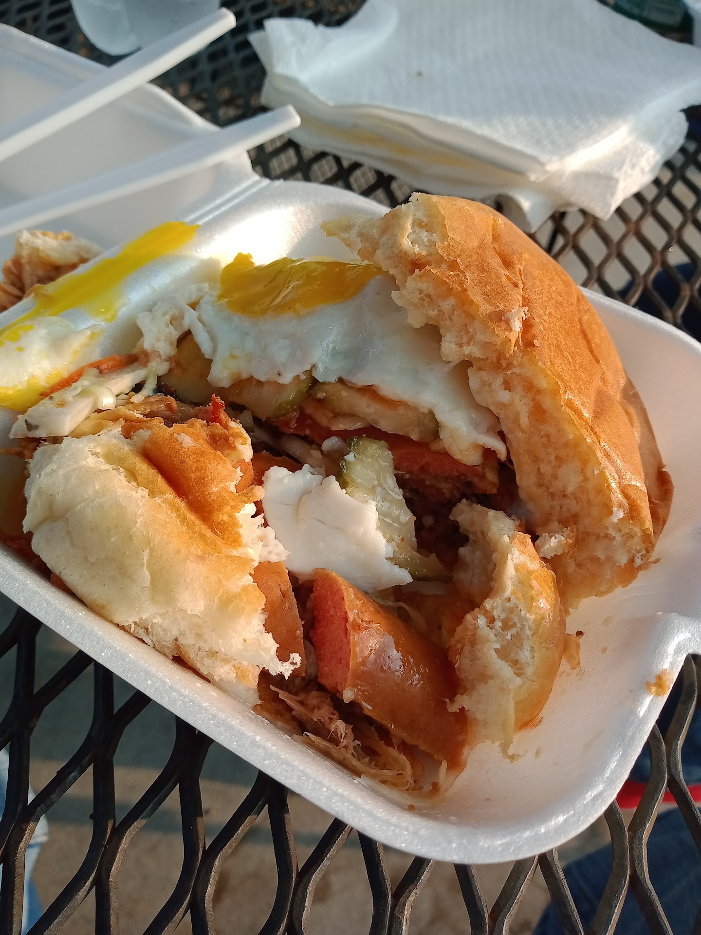 Jeff does a great job with his smoking and the pulled pork Sammie is delicious. The Owl Stacker is a hot dog on a burger bun with pulled pork, slaw, pickles, and a fried egg with apple habanero BBQ sauce. It's a mouthful!