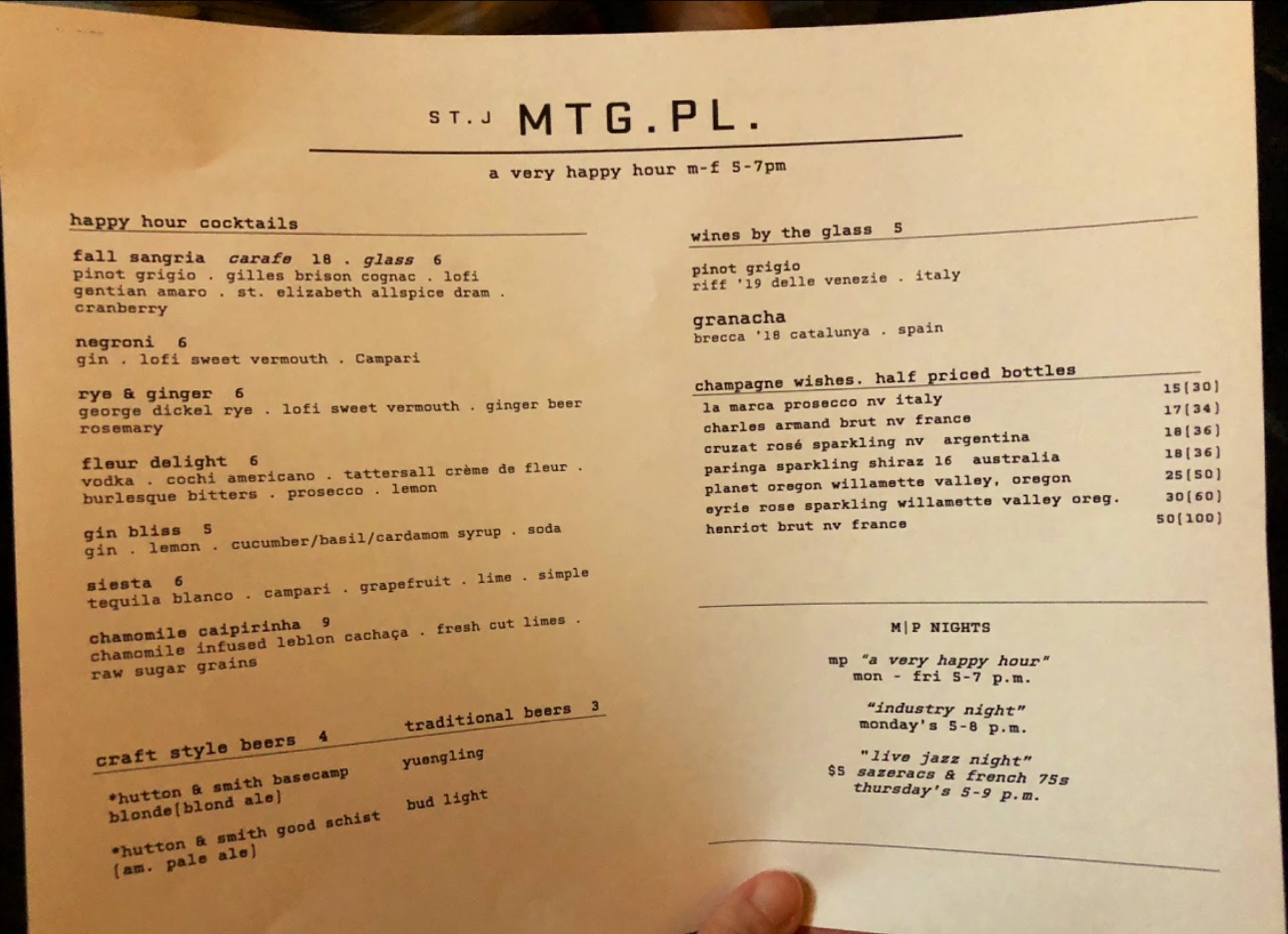 Read moreMy wife and I’d been to St John’s for our anniversary and it was great, but we thought for this one the meeting place might be worth a try. We had an absolutely wonderful time! Our server, Josh, and the accompanying staff made our dinner and experience truly special. We felt welcome, listened to, not sped along, and as though we were the only customer there. I didn’t realize it until I looked at the time as we were leaving, but we were also around a half hour earlier than expected, but the hostess sat us without issue or mentioning our misstep.