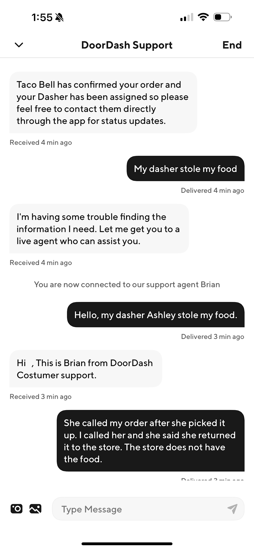 Additionally, the DoorDash driver contacted me and stated that they would return my order to your store. However, the order was never brought back, and the driver provided conflicting information, claiming at one point that the police were involved and had taken over the situation. I later discovered that the driver had been dishonest about what actually happened.