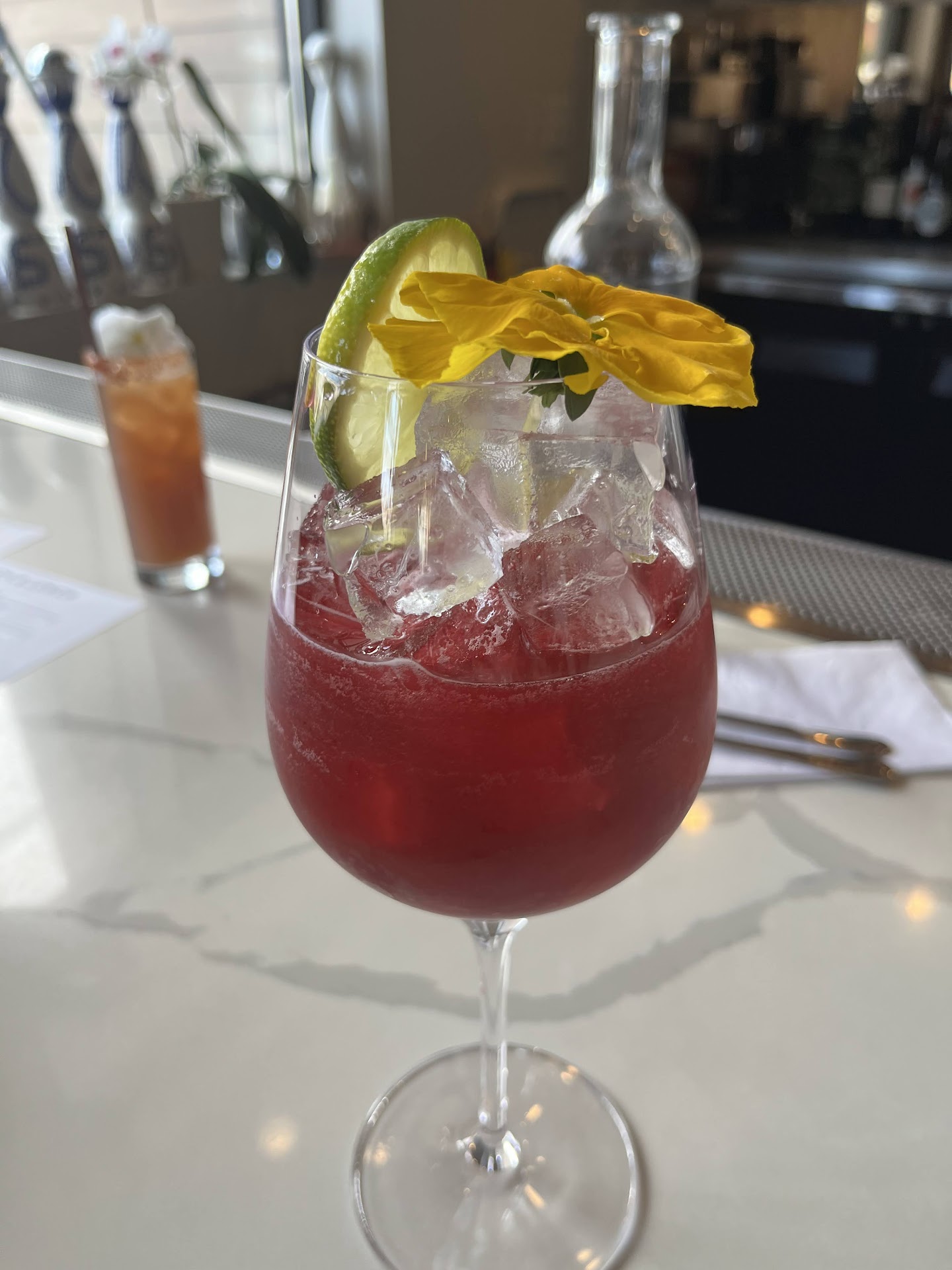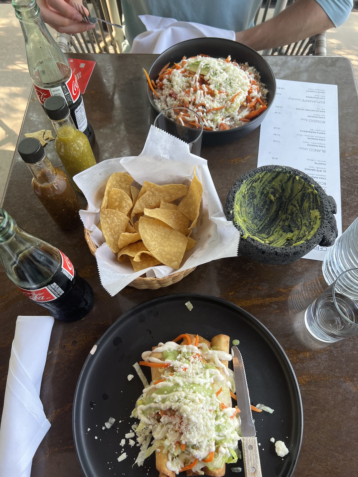 FYI, the margaritas come from a pre-made batch and for us are pretty par - just have a touch of that "neon" (fake/old lime or sour mix) flavor. The mezcal old fashioned was really good. There's another cocktail who's name I can't remember which green chartreuse in it, and it just tasted like the base margarita with a hint of green chartreuse added to it. Meh.
