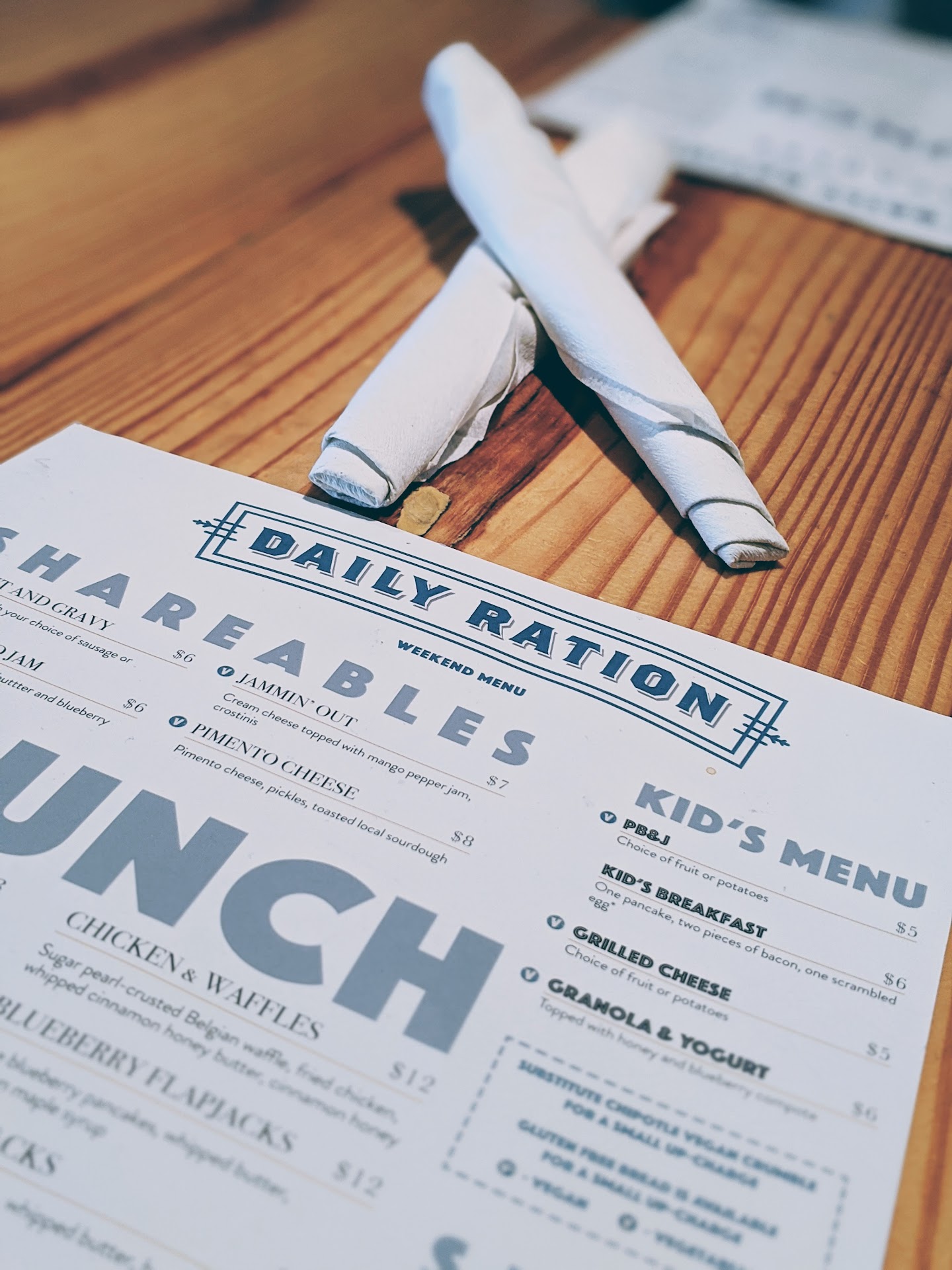 Myself and two friends came here today around 10 AM and The Daily Ration was understandably busy. We were told it was a 20 minute wait but it turned into 45 minutes. I'm not going to fault them for being busy but if we'd been given a more acct estimate we might not have stayed. We started by ordering two drinks during our wait from the cafe. I requested to-go cups as we were standing for a long time and I didn't want to balance the hot cups and saucers while we stood with no place to set them down. One was placed in a to-go cup and the second came in a mug and a saucer which was difficult to hold for the next 30 minutes. Not a huge deal but very inconvenient.