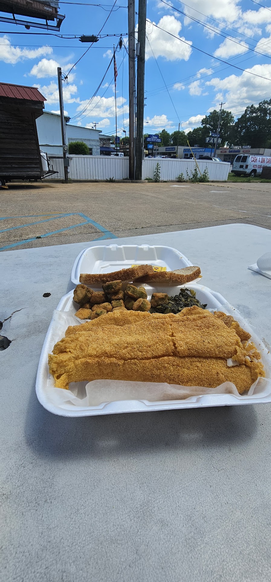 Purchased 2 plates: The 2 piece catfish plate with baked beans and okra and the whiting fish plate with mac n cheese and okra Add ons were side of hush puppies and the fried green tomatoes. Total spent $41 and change. 1st time eating at Uncle Larry's, and it was enjoyable. Okra was amazing, cooked thoroughly, and flavored just right. Baked beans tasted like canned bush b.b, Fried green tomatoes were okay, the breading was a bit heavy and a bit meally from the breading. They had a firmness to them, which I could tell from the texture they were the perfect ripeness. I was looking for excellent but this would be a 2nd best compared to other restaurants. Fish was moist and large pieces. Mac n Cheese was decent. It did not have a WOW factor for me. My husband, on the other hand ENJOYED IT Food was also made to order and was fresh. Local spot on East Brainered Road: If I wanted some fish, I would put this...