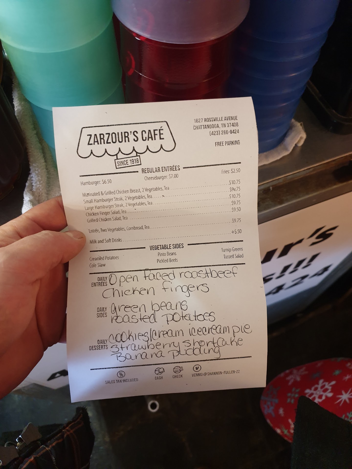 Love this place. I worked there washing dishes two separate summers while home from college. They were my introduction to the restaurant business, and what a great intro it was. A free meal every morning before my shift began ensured I received the freshest of samples of whatever the menu had to offer each day. (Personally, my favorite day is meatloaf day, along with their delicious cornbread of course- add butter and a dab of hot-sauce to each piece). You cannot beat Zarzour's meatloaf with homemade sauce. When I worked there, Shirley (RIP) was still there serving up her delicious homemade pies (chocolate ftw) daily, while Mary worked the kitchen and Shannon wo-manned the grill. Those two are still at their respective spots, and are two of the most memorable personalities I have ever had the pleasure of meeting and working with. Even if you only visit once, I'm sure you will agree. On to the food: If it isn't meatloaf day, the kitchen meals are still fantastic, but I recommend bringing a friend so you can not only sample what the kitchen has to offer, but also have what is the GREATEST BURGER I have ever had. Each one is made to order by Shannon, and without fail, each one of her burgers are downright amazing. There's no secret sauce or special meat marinade, none of that; just a little bit of love and simple, classic ingredients, like most other menu items you'll find there. Each burger is made to order with fresh ground beef (NEVER FROZEN); Shannon grabs a heaping handful of beef and shapes out a large ball of meat, then splats it down onto the grill, letting the grill press do the rest of the shaping. While that cooks, she lightly grills the underside of each bun before adding whatever condiments/additions you request. For me: "Cheeseburger All-the-way No Green add mayo." Even though it's technically not ATW, it's much easier saying it that way. Try it...