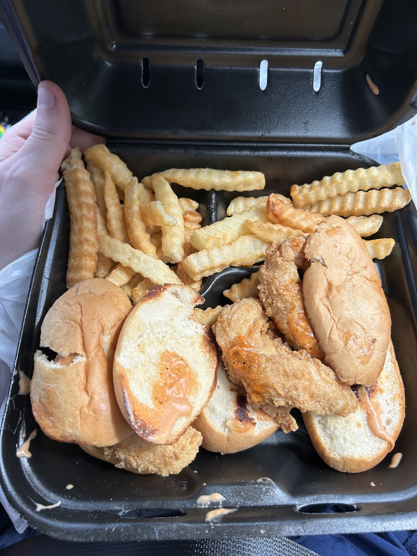 I went on my lunch break to go grab what I thought was going to be some amazing Zaxby’s, yet I opened a box of horrors in my vehicle. And that wasn’t even the worst part. We ordered in the drive-thru, and ordered a spicy signature sandwich meal, the three nibblerz, and two drinks. Upon pulling up to the window, I noticed the gentleman about to fill our drinks, but accidentally knocked them into the floor. Luckily those cups weren’t just picked up and re-used, but instead we didn’t get them at all. The gentleman, whose name was Tino, proceeded to hand us a bag with only one of the meals and neither of the drinks. I then entered the building, and waited patiently at the counter for assistance. It took a second, but the gentleman eventually came up to ask what I needed. However; he did not greet me with a, “What can I get for you?” Or “Is there something you need help with?”, but a sharp and in an annoyed tone, “Yes???” I then explained to him the situation and he asked, “Was that all?” I responded with a “Oh, and the drinks”. I was not rude in any fashion, but this man then bulged his eyes with a shocked look and proceeded to roll them at me. I did not catch his name, as I was already appalled at the service I was receiving and could not believe he just rolled his eyes at me. An unkempt older gentleman in the back was working on my nibblerz. The only saving grace of this customer service experience was a woman who checked to make sure I had been checked on and that I didn’t need anything else. After this entire fiasco, I opened my box and this was the absolute horror that I had to bear witness to. A completely demolished nibblerz meal. Whoever made this meal should be ashamed of themselves, as they clearly ripped my buns and had not even the slightest care for his job at this establishment. This was hands down the worst customer service experience I have ever endured in my entire existence and the Zaxby’s on Signal Mtn Rd should be ashamed of themselves. I don’t even know if this could be made right, but I would at least hope an attempt...