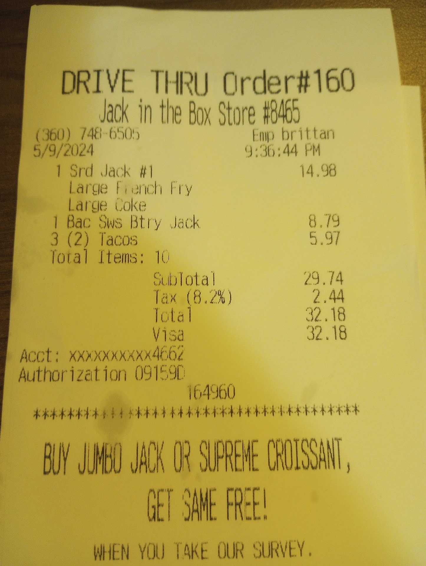I was not given my receipt. And my fault for not being more aware of it at the location but they charged me more for my meal that they actually were. Chicken strips with fries are about 7 and I was charged 10.