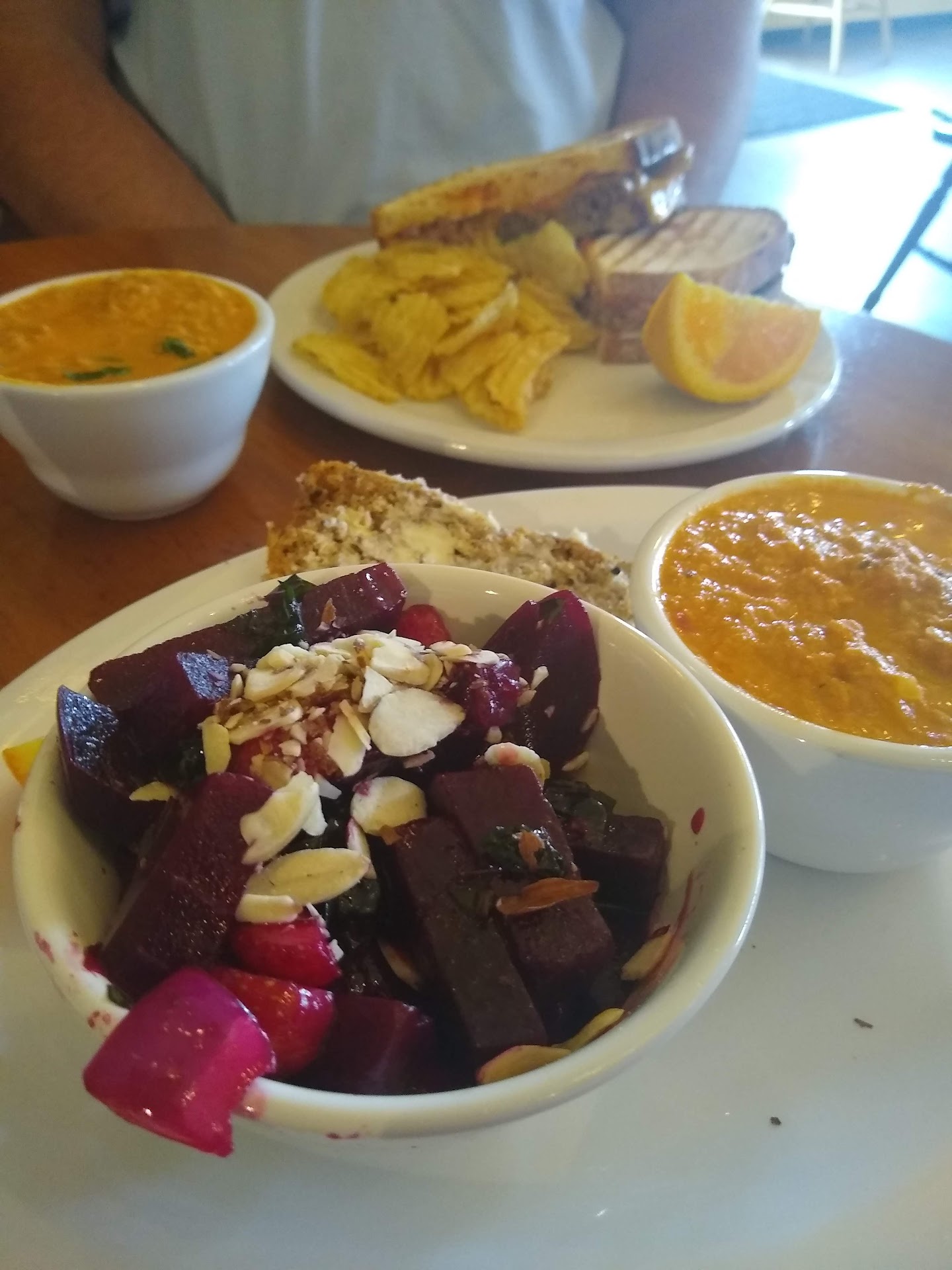 Read more4.5 stars from us. as with a lot of folks, we learned of this place through DD&D so we timed our trip through the area for lunch. off the beaten path but worth seeking. eclectic decor makes the wait pass easily. wide ranging menu with interesting ingredient combinations for sandwiches both hot and cold, served on homemade breads. also serving soups and salads. wife chose to go light today and order the salad special along with one of the days soups, salmon bisque. the salad was a local beets and berries combination served with sliced almonds. she enjoyed this very much, with the fresh berries adding a nice sweetness to the tart beets. my order was the hot panini with homemade meatloaf. this was served on a rustic white bread and included marinara, pesto, and grilled onions. staff gladly swapped the cheese from havarti to my preferred cheddar. the sandwich was wonderful, full of flavor but without any one ingredient overpowering the rest. the bread was delicious and perfectly grilled. the meatloaf had great flavor-did i detect a hint of Italian sausage in there? anyway, it was a top sandwich for my '22 dining so far. the one issue we had was with the salmon bisque, which i chose a cup of to go with my meal. First let me say that the whole grain bread they serve with the soup is phenomenally good. Moist and flavorful, I’d buy loaves if I could. it’s that good. The soup smelled great and the broth was very tasty but we just could not get past the unpleasant texture of the salmon meat that was in the soup. truly a bisque should be a cream soup without chunks and this version unfortunately brought to mind the texture of pet food. we would not order again and do suggest a recipe revamp on this. this is the only thing keeping the review from being 5 stars. by the way, the pastries & cakes looked fantastic and it took all my willpower not to try the wonderful looking carrot cake. next time. IMO if you are ever coming this way, you won't find a better...