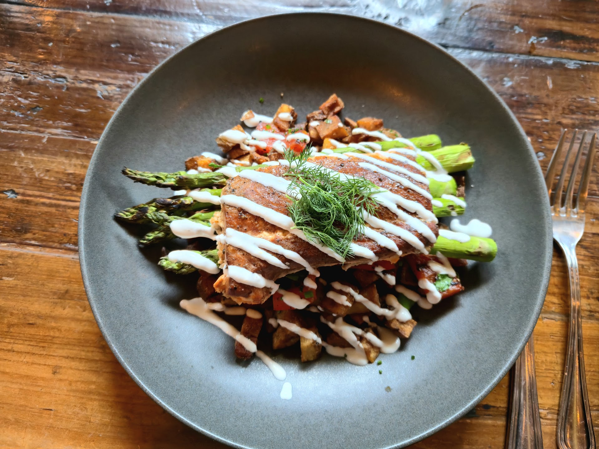 The cons: • Slow service. Due to this being a new restaurant, it seems like they aren't established well enough yet to get the tables turned over fast enough for the crow. Additionally, the waitress took a bit too long when it came to either checking in on us or delivering the que'd up drinks. • The food. I had the steelhead hash coming in at just about $26, which is slightly high, honestly, for the quality of food that was served. The fish was dry, the potatoes were under seasoned and felt reheated (but were perfectly cut), and the asparagus was both overcooked and under seasoned. Additionally, the bell peppers that were served were placed under the steelhead. With such a beautiful array of color available to the dish, having the bell peppers diced and thrown into the potatoes woildve been the smarter route to go. Lastly, why wasn't an egg served with the hash? It would've added a level of complexity that the dish was so craving.