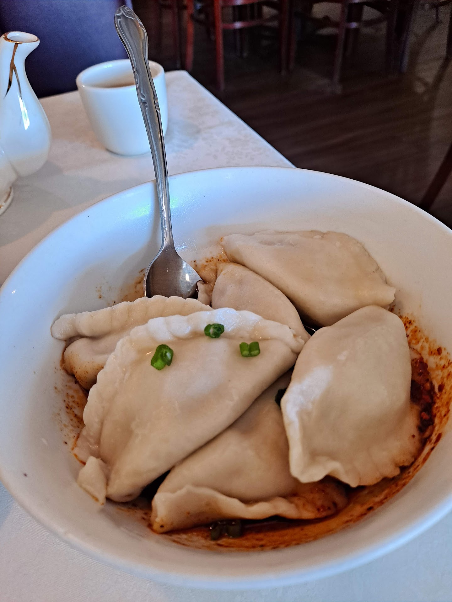 Following this is the Chicken with Pickled Mustard Greens (13.50). "Stir-fried with pickled mustard greens and cilantro in white sauce." No cilantro. The veggies were cooked well, tender but still firm. The dark meat chicken was juicy and tender. The mustard greens were mild and could have been pickled longer. It was an agreeable dish but a bit too bland for me. I asked for some chili oil and was really glad that I did. The chili oil was delightful, not super spicy but very aromatic. I might ask for it regardless of what I order.