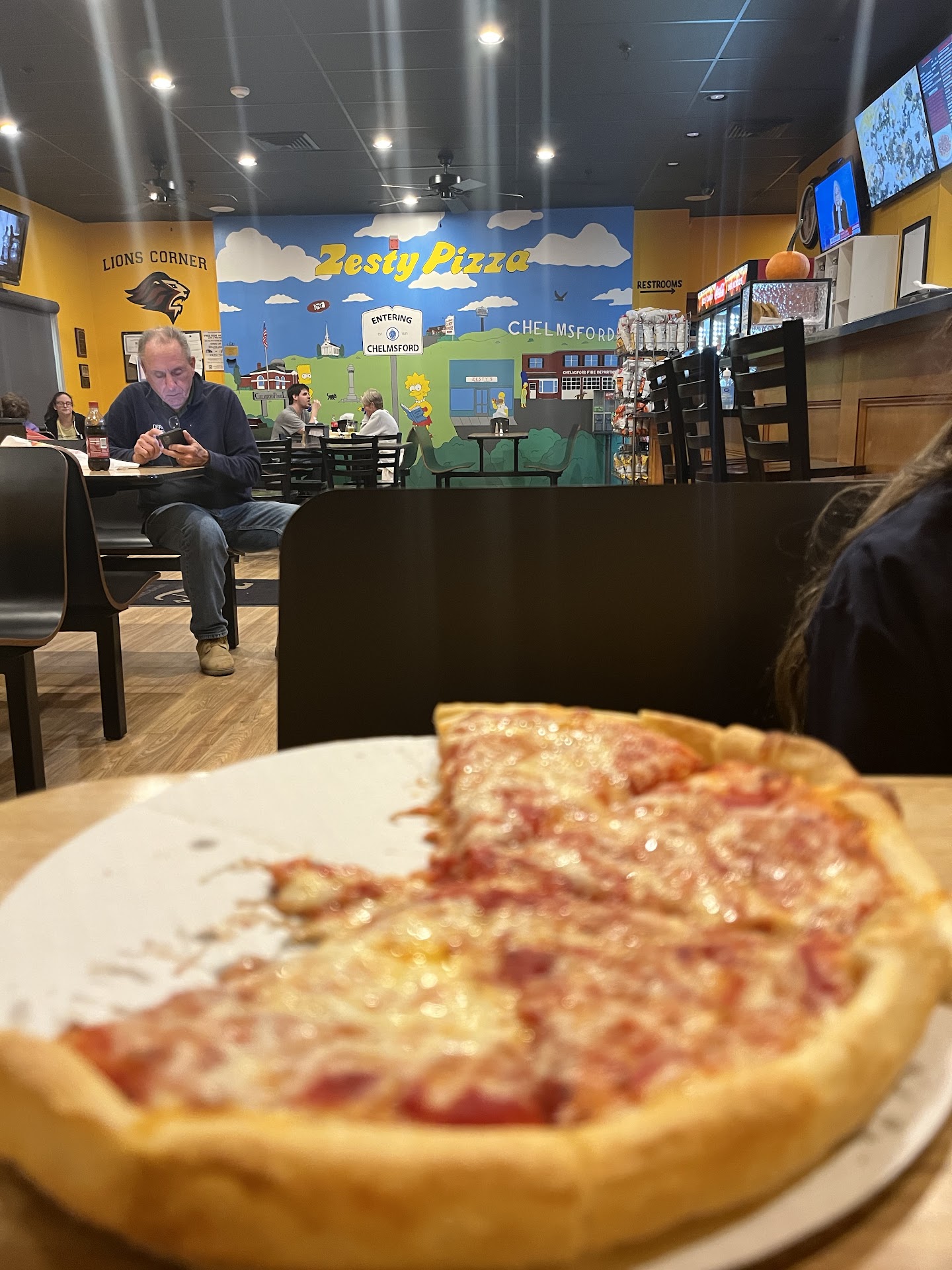 Read moreI like this place. The tomato sauce is zesty as the name implies. The pizza is New England style, with fresh tasting dough that isn't thin (New York-style), but not excessively doughy either. It's just right. The toppings tasted fresh and the cashier/waitress was very efficient. The mural of The Simpsons makes a great background for the restaurant. In fact, the Simpsons connection is what drew me to the spot. Their salads are better than average and the steak tips are some of the best I've tasted, marinated and grilled to perfection. Mmmmmmm. I'm getting hungry and I'm going back to Zesty's....