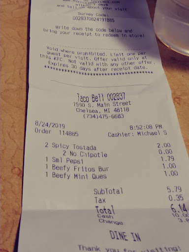 While the food is good. The service whether ordering Taco Bell or KFC is either untrained or uninterested in follow through. Do NOT leave the window without going through you bags. We travel I94 between Jackson and Ann Arbor several times a week. Often we drive through for dinner/ most often KFC. We used to have to call after leaving the window and being back on I94 only to find we didn't have silverware, or part of our order was gone. Lately we don't leave the window until we go through everything to double check the order. One night we asked for honey, the kid was certain they didn't carry it. I had to ask him to go ask a manager to show him where the honey was. Tonight we had to ask them for our drink and for silverware. When we ordered they didn't know what a snack box was. They charged us for each piece of chicken and the biscuit seperately. If this were occassional I'd say it's just fast food. But every time we drive through here there is a problem. It took us 5 minutes at the window with people waiting behind us. I'm tired of getting half an order or not being able to eat it because we have no silverware. While I like the food and the convience of it being halfway between our drive the sevice never changes. It never gets better. If you call them they will give you your meal free next time but it doesn't change that you may not be able to eat the one you have with you. I'd rather they get it right...