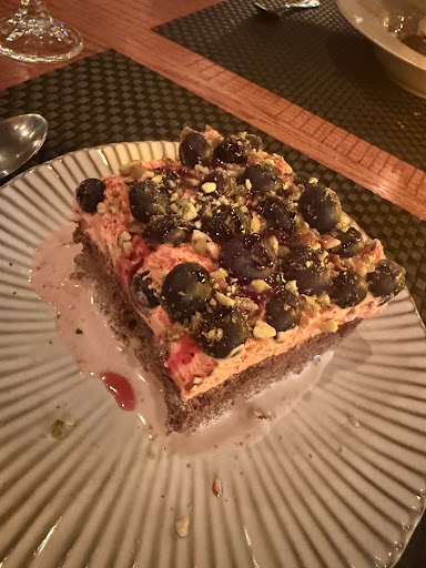 I forget the name of the dessert but it was delicious and not too sweet. It had fresh blueberries on top and crushed up pistachio and walnuts with a light fruity mousse.