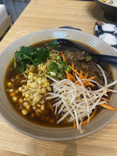 Read moreUpon entering Supa, it appears very simply appointed and clean. The tables and chairs done in lighter colored wood enhance the light and cleanliness of the place. Each table has a plastic tub holding chopsticks completely encased in sanitary paper and a small pottery containing soy sauce. If you haven't ordered your food online (which I've yet to do at this point so can not review on this service) you'll need to walk to the counter several paces from the front door. The owner was present and quite pleasant and friendly. Happily answering any questions about the dishes and drinks available. We ordered the gyoza(4 pieces), which came with a shallow dish of ponzu sauce (a mild flavored sauce), which, when combined with the dumpling was very pleasing to the pallet. Next up was 3 pieces each of Tuna roll, Philadelphia roll, and California roll. They asked if we would like a separate dish to go with that which we accepted as we like to mix the Wasabi with the soy sauce for dipping our sushi in. The ingredients were very fresh, the rice was sticky, and it did not fall apart while dipping. While it was delicious, I couldn't help but think there was something missing about the rice ( I still can't quite put my finger on the answer to that as yet). Next was the Ramen bowl. I've never had Tonkotsu Ramen before, but I'll definitely be back for more! Tonkotsu has a pork broth base, a few pieces of pork belly (not too fatty, each a couple of inches long), ramen noodles, julienned carrots, sprouts, a modest crown of broccoli, and one soft boiled egg cut in half. I got the unspicy option, and my husband got the spicy option. The first bite to the last slurp was so delightful! The broth was very clean tasting. Which is to say it wasn't laden with fat that would line your mouth to obstruct any of the other wonderful flavors. The pork belly was meaty enough to provide a very nice satisfying chomp and needed to be bitten in half or thirds, which wasn't terribly difficult to do or awkward. Husband thought I should try a sip of his spicy Tonoksu broth for comparison. The spiciness wasn't too evident at first sip but was gradually warm and stopped before my personal panic point was met (I'm really a wuss about hot spicy foods, though, to be fair I'll will be steering clear of their 'Supa! Hell Ramen.lol). To drink, we ordered peach and mango cheese tea with Boba. It was very good, different, but good. It says 'cheese,' but to me, the topping was more of a heavy whipping cream type of texture. I did not take the lid off to explore further as I was more interested in the Tonkotsu at the time. The price point was easily on par for eating out these days. We WILL be going back to explore their Poke...
