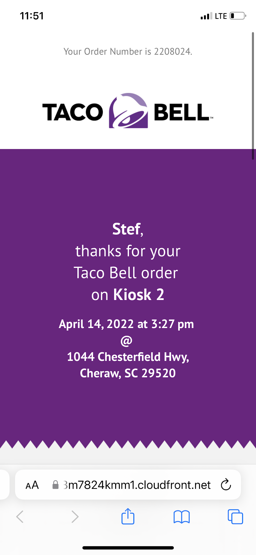 Read moreWell.. another review. I'm honestly shocked how this place gets it wrong every time. First off, as per usual, they shorted me on my order. 2nd, never ONE time, have a received a chulapa from there where the shell is cooked properly. They are ALWAYS undercooked. Then there is the issue of actually properly filling their shells. Stopped at a taco bell in Shelby NC with my daughter and we both laughed hard, at how they ACTUALLY filled their tacos properly. Do better Cheraw Taco Bell. It...