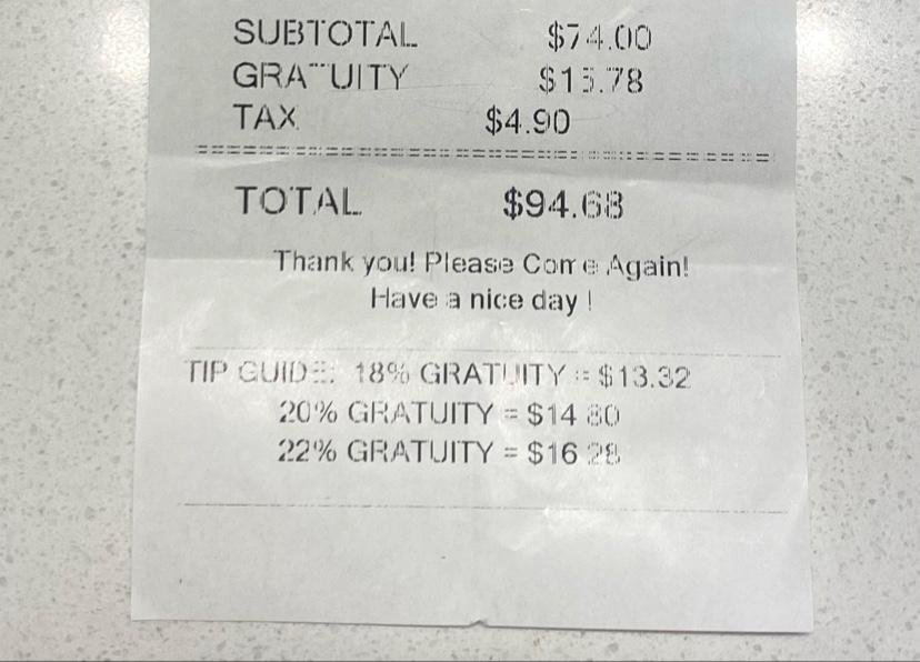 Tips are to be calculated based on the total cost before tax, and should be based on your personal preference and the level or quality of service you received. We did some calculations and we found out that the extra in tip (beside 20%) on the check is tipping tax. However, the sale tax doesn’t go to the business, it goes to the state.