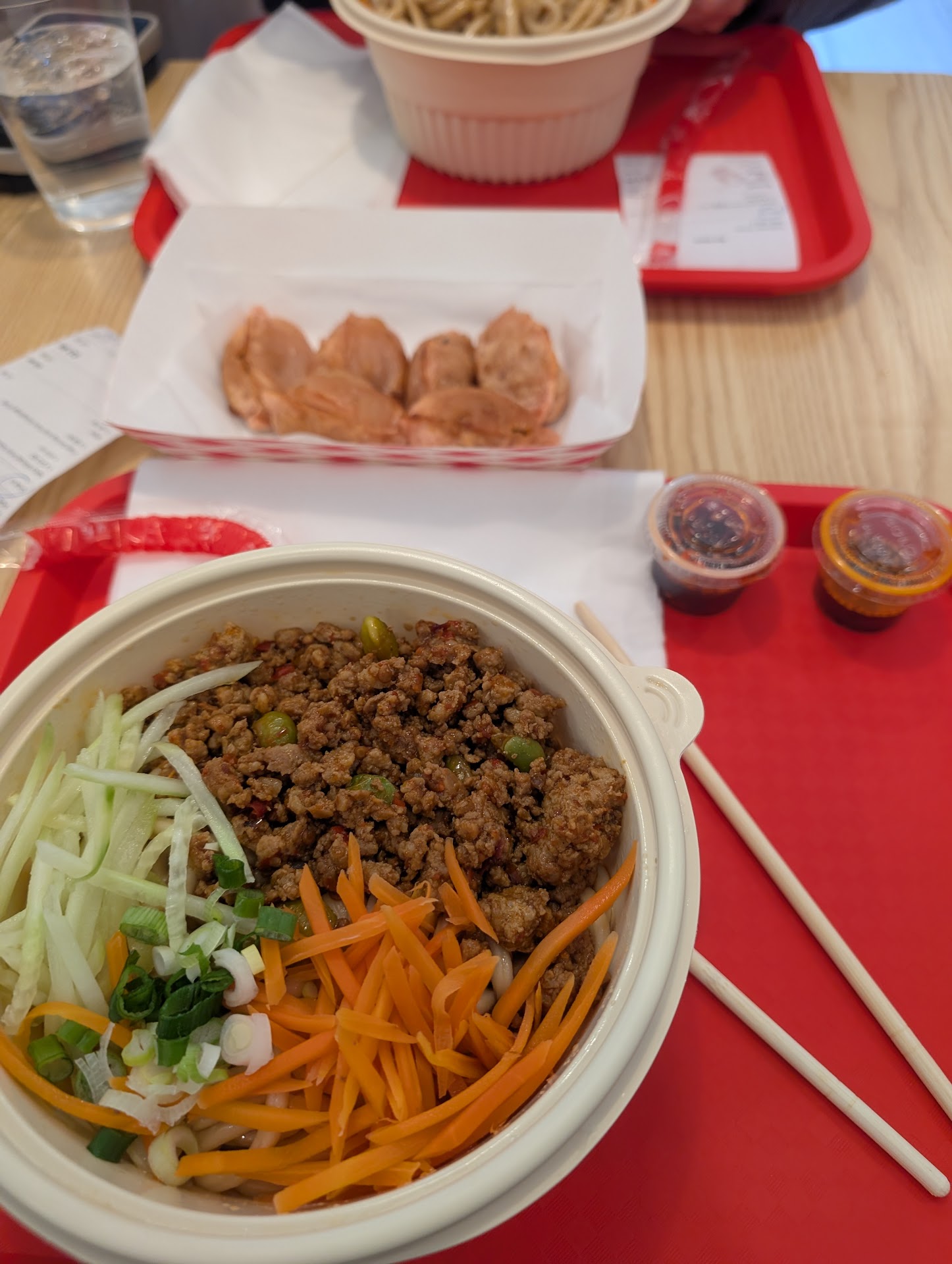 The noodles were hot and spicy and savory and when mixed with all the toppings were amazing slurped. I finished my entire bowl and was full. I think this is a perfect takeout or sit and wait spot. I think in the future when I'm not starving I would let my noodles sit a bit in the sauce to really get the flavors married.