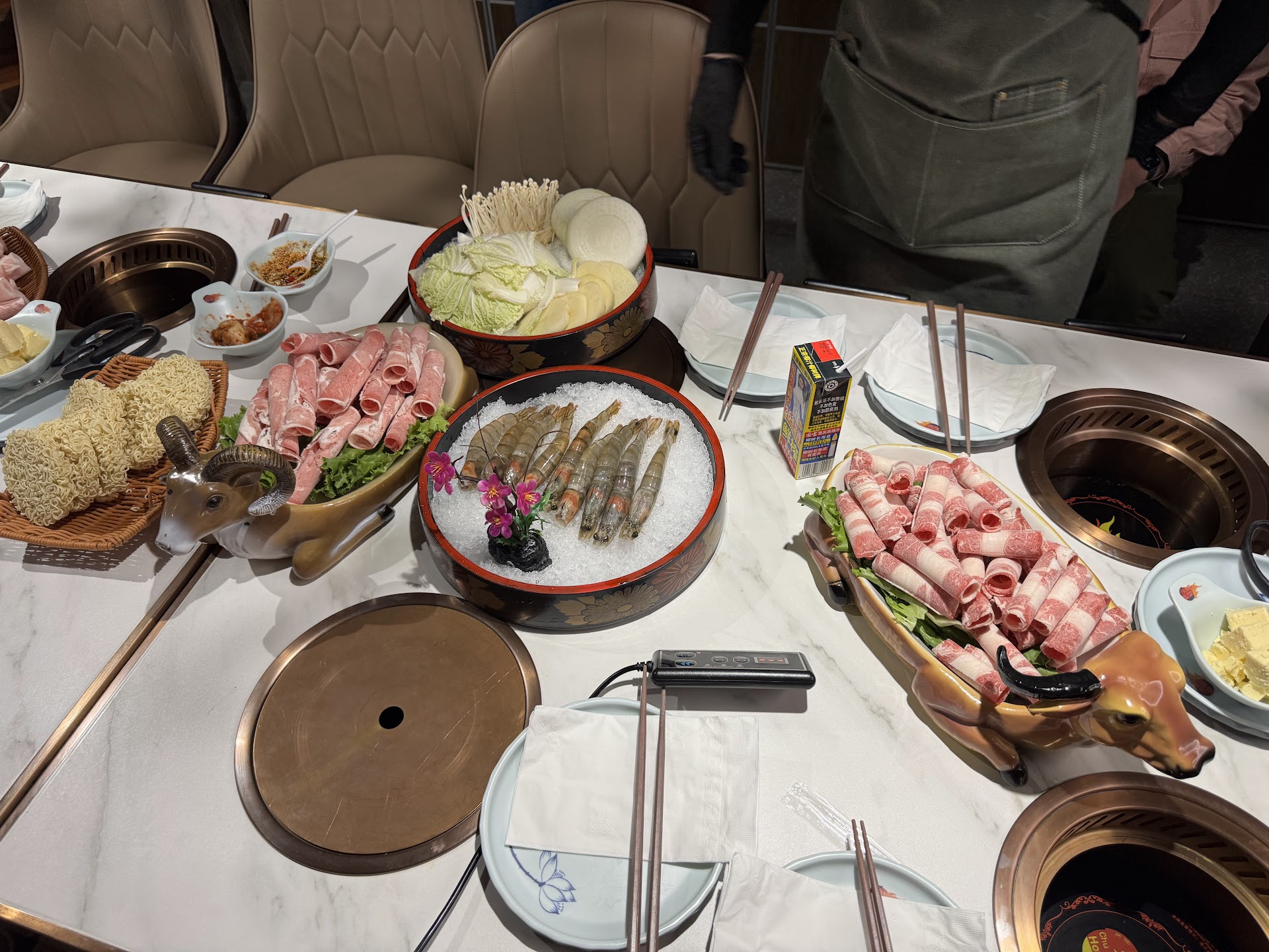 Food was either great, or meh. We chose to do only the BBQ portion, and that limits the meats you get tremendously. Looking at other pictures, the thinly sliced beef, which at other hot pot/KBBQ places can be put on the grill for quick bites, was not an option here. Their angus steak cuts are a bit tough, and their bulgogi beef is just square-ish cuts of big tenderloins I believe. Sauce wasn't amazing, but it was the most tender of the slim choices. Garlic chicken was great! We even let ours sit a bit too long and they were still tender and juicy. Garlic shrimp was the biggest favorite for us and the kids besides the mussels. I feel like the BBQ meat options were super slim pickings.