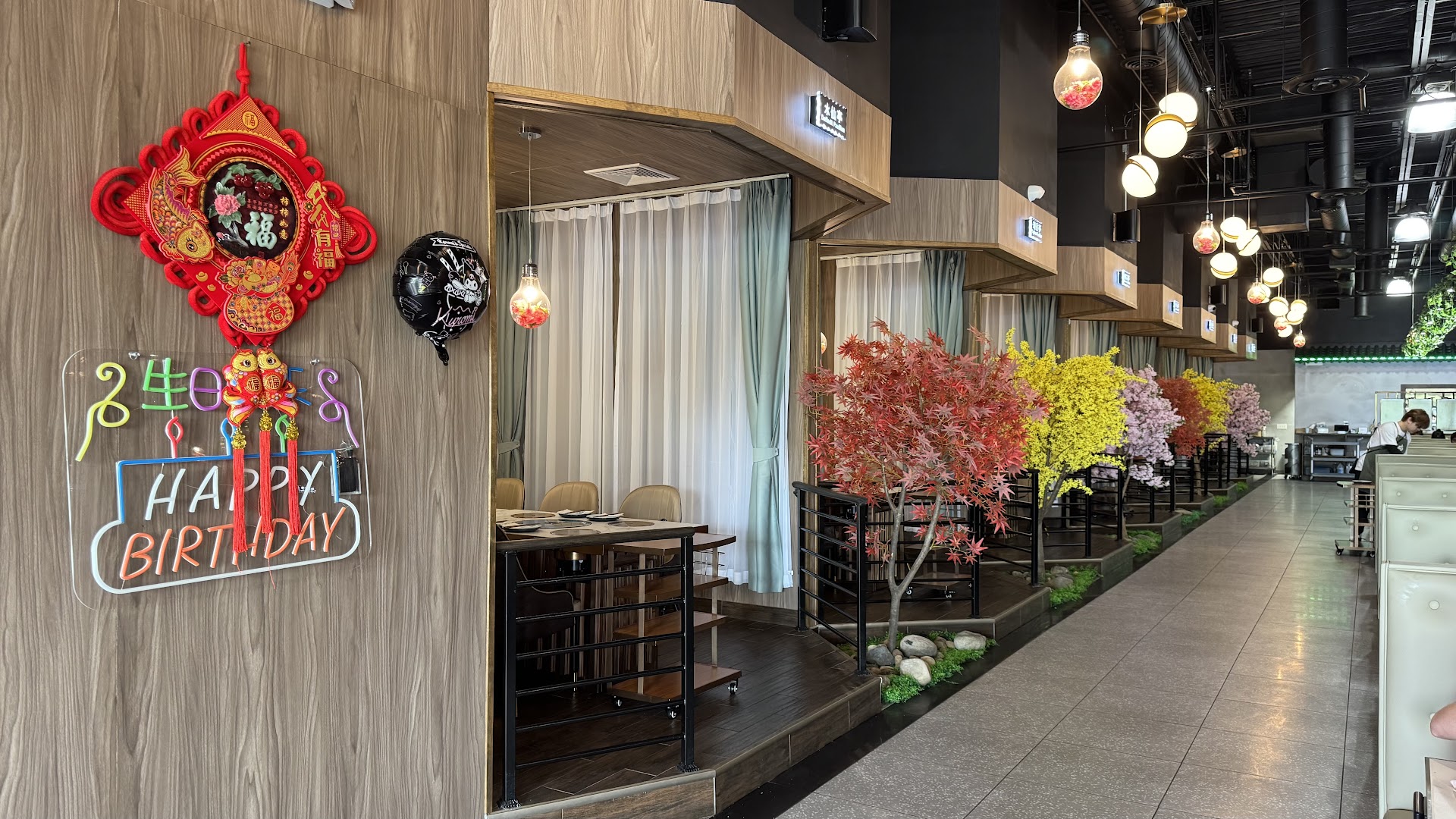 Right away you walk in and are greeted with huge fake cherry blossom trees that look amazing. Off to your far right, there is a play area for kids (HUGE THANK YOU, coming from parents of 3). There are delivery robots, staff placed strategically and most people happily conversing or on their phones while eating.