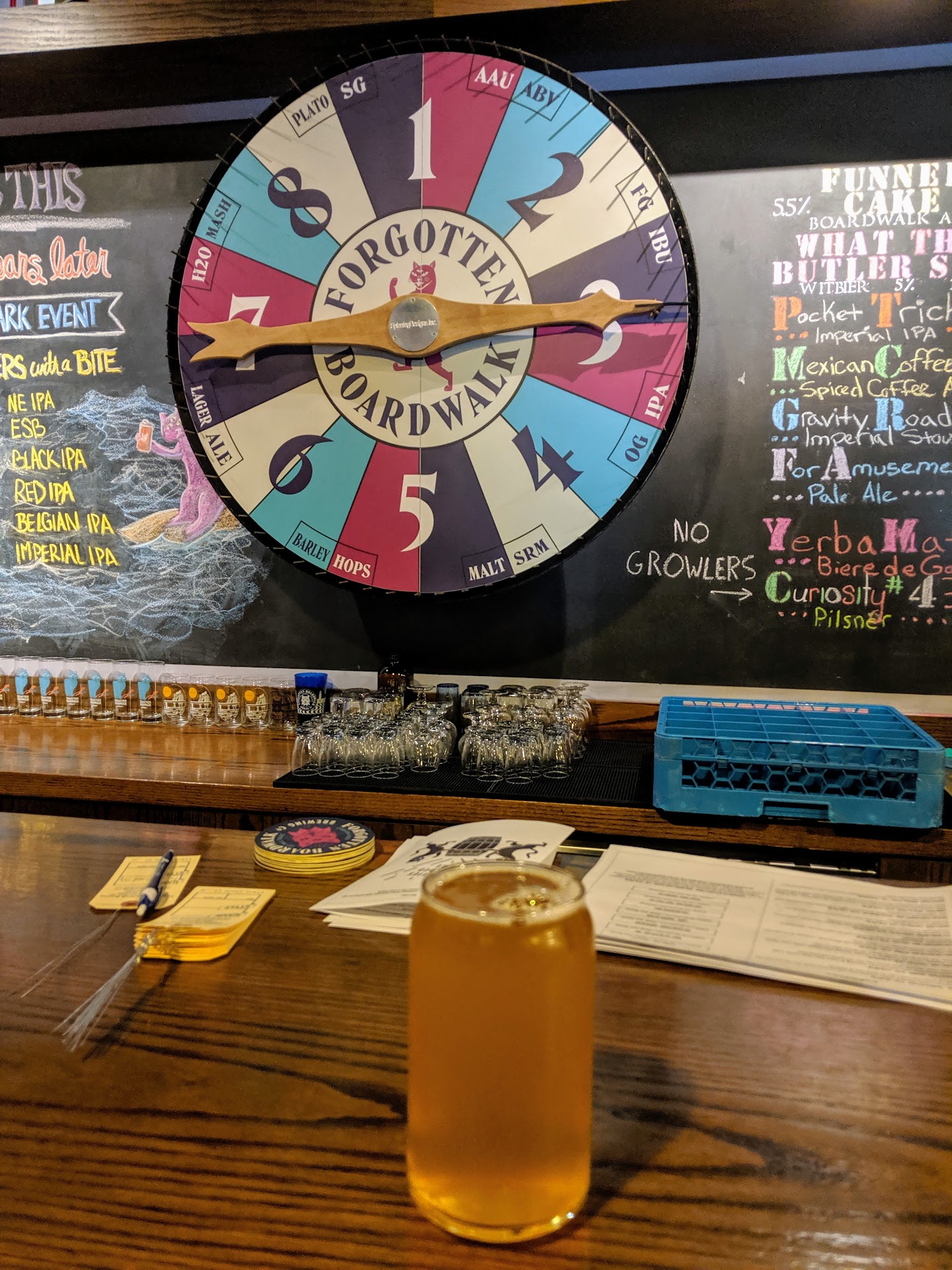 Read moreNice place to bring your family or some friends to enjoy a nice brew or two. The decor is that of a shore town boardwalk — a Carousel horse, skeeball, funny mirrors, those fortune telling machines you always see and if you dare, hope you get a good fortune from. We did the flights. $16 for four beers of your choosing. I did 1) Shore Shiver - Hazy IPA - 6.9% - nice IPA taste. On the mellow side but very enjoyable. 2) Corporate Carrier Pigeon - Hazy IPA - 6.2% - a bolder IPA - my personal favorite. I bought four pack to enjoy at home for $16. 3) Seen Missing - Crisp IPA - 4.5% - Nice Flavor. Enjoyable. 4)Scrooge McCat - Holiday Shandy - 3.5% - although I loved the name, it was my least favorite of the four samplers. Definitely had holiday spices but reminded me of ultra sweet cough medicine. Would not order this one again. The other 3 most definitely. Crowds kept to themselves so definitely come with someone to keep you company. Inside and outside seating. We had a nice table along the wall so we could enjoy our beverages and...