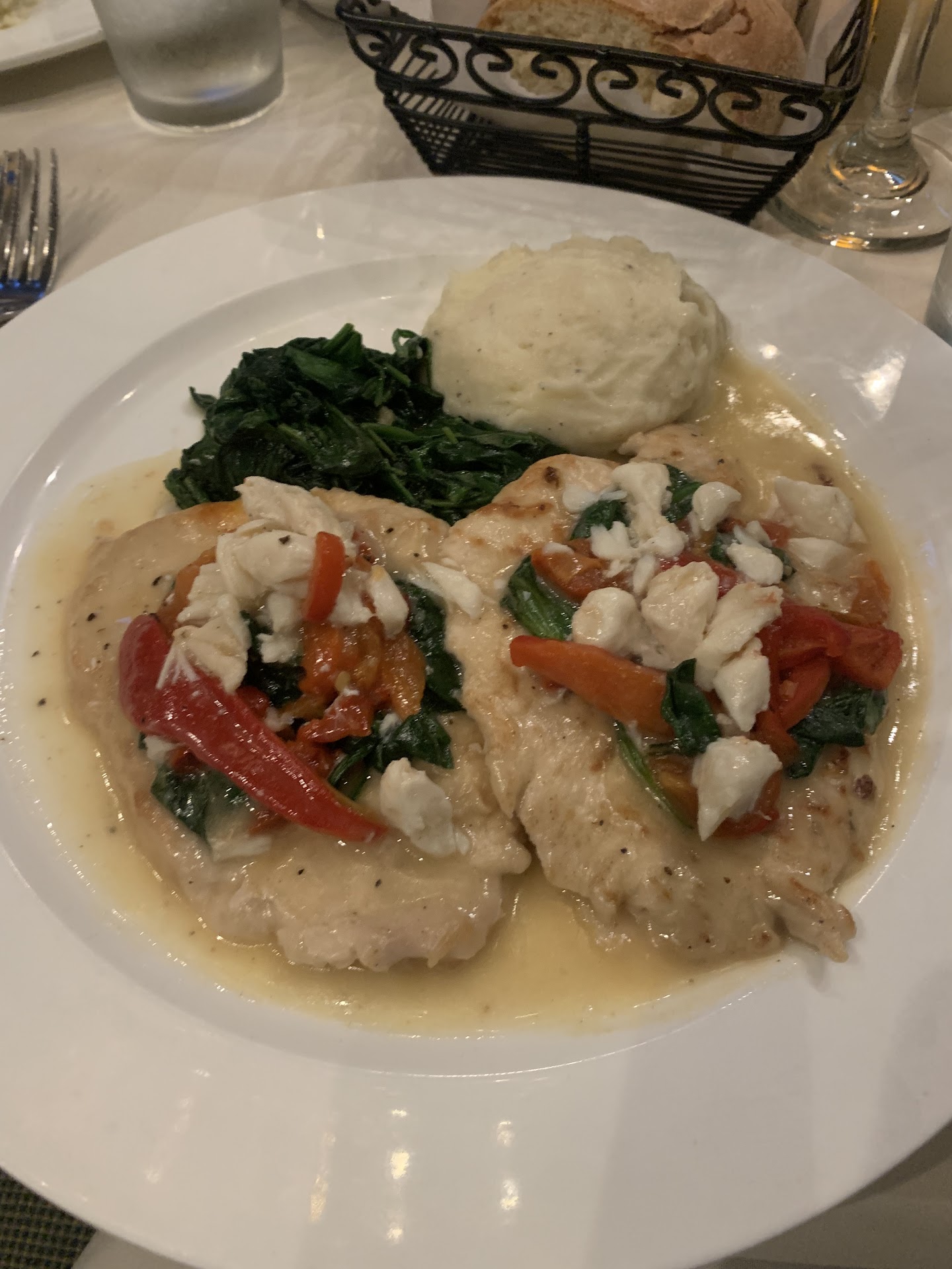 My wife had the salmon which she said was very good. I had the Veal Villagio. Paper thin veal cutlets that were WAY over cooked and tough. Potatoes were hard and crunchy (like they sat under a heat lamp for a while.)