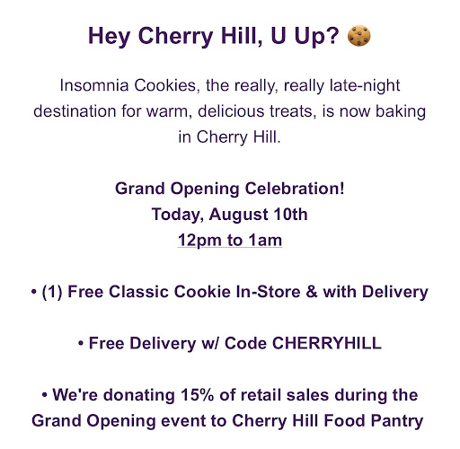 Read moreWe are dedicated insomnia cookie fans, we normally go all the way to Philly for them. We were excited find one closer to us, we preordered which didn’t matter. Still had to stand in the line, the staff gave no directions on pickup. People complain about customer services in Philly but at least they acknowledge you in the Philly locations when you ask about orders! Prolly just going to stick to the Philly locations.