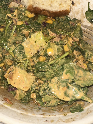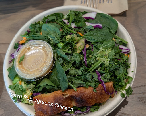 Tokyo Supergreens with chicken is a bit light on the dressing (even with heavy option) to mask some of the bitterness. Also very light on the chicken, I'm guessing most of the protein is in the edamame. Bread is like a bread stick. Or like the crust of a pizza slice lol.