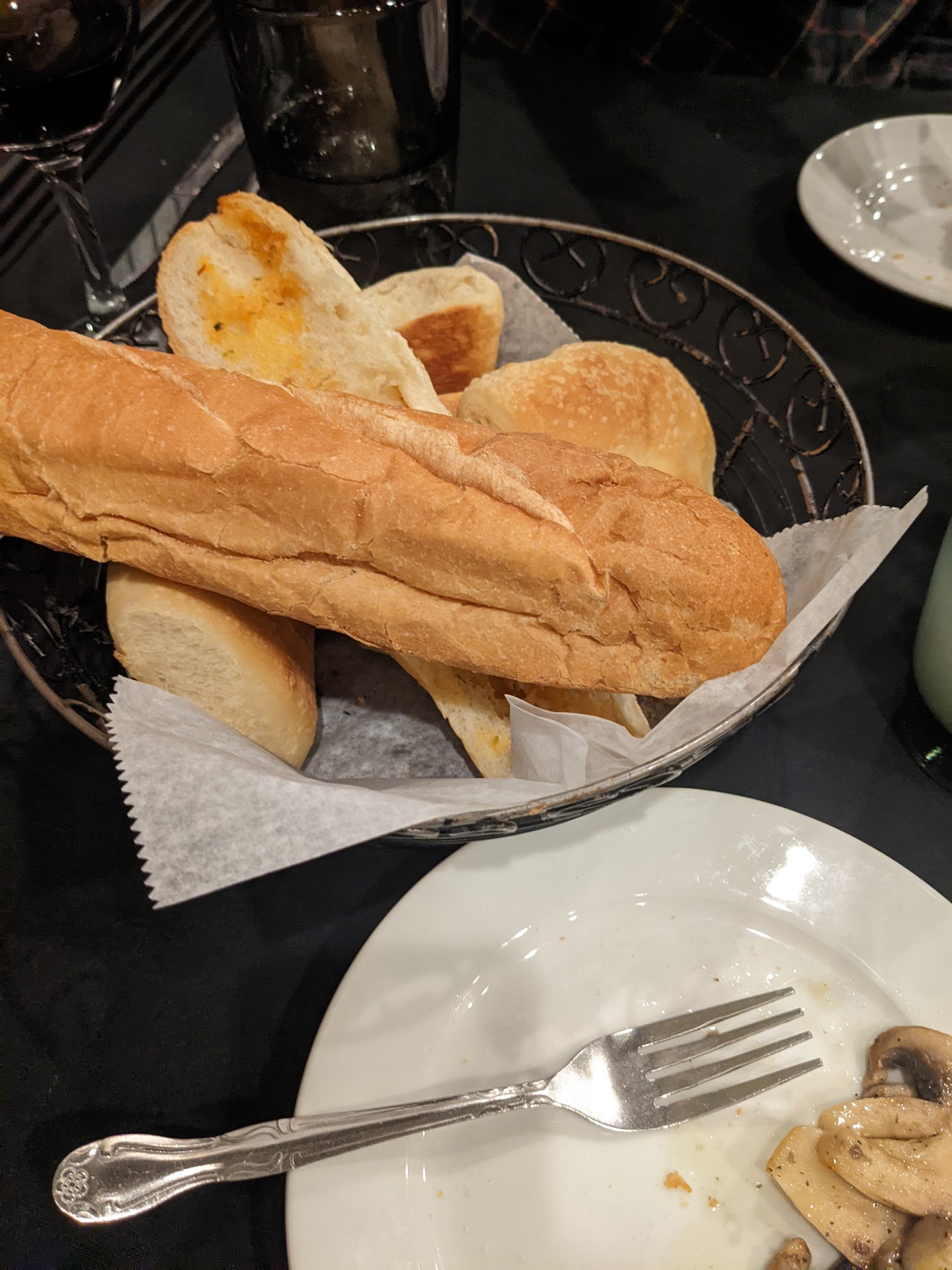 Also the bread. Garlic bread was alright, but the bread underneath was wonderful. Just, the best, most delicate, pull apart in your mouth delicious bread I've had in a very long time. I ate it as-is, no butter or anything. (Later realized the butter was buried in the bottom of the bread basket.) It did start to get stiff when it cooled, so it wasn't nearly as enjoyable. Make sure to go after the rolls while they're still hot.