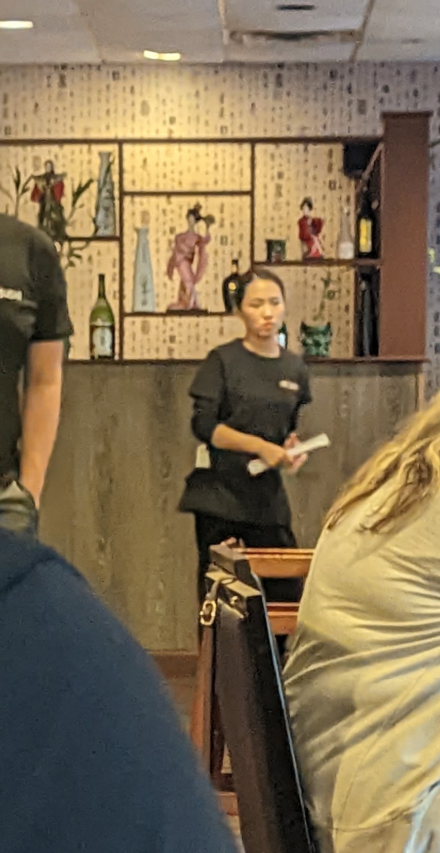 2... The server that I have included in the pictures is very unfriendly. She makes you feel like you're ruining her day by coming in to eat. She wasn't even my server...but she stalked my table for the hour I was there, commented on the amount of food ordered, made jokes about it to the sushi chefs,and made the entire table feel uncomfortable. Wish she actually WAS my server today, so I could have have tipped her NOTHING. The man that served on me was great, but she ruined the experience. She makes you feel like your a fat animal and it's feeding time at the zoo. She...