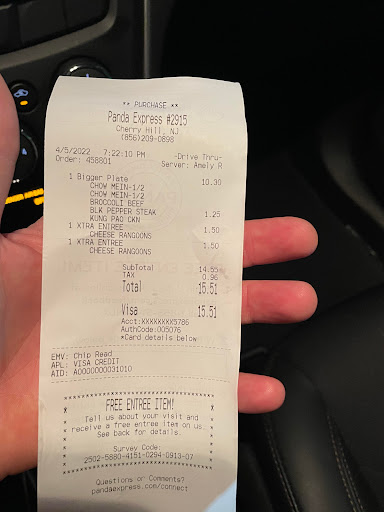 Read moreSo I made a mistake and thought they had forgotten the receipt to my food. I thought this after just leaving and checking my bag and not seeing the receipt right away. Anyway I go inside and wait in line to speak to someone. They were getting busy and were not able to help with my issues at that time. I needed to get back to my hotel to eat and get ready for bed. The manager I am assuming Terrell asked me to write down my order and phone number because I said it would be ok for him to text me the receipt. This was an awesome way to handle the situation. I needed the receipt because I was on a business trip and my company would only reimburse my meals if I had a receipt. When I got back to my hotel room and started laying out the food I found in the bottom of my bag the receipt. I felt very foolish. An the today I received a text containing the receipt. So I am writing this review as a way of thanks to Terrell and the crew for helping out with this issue that I caused. They are great patient people that have follow through. I hope the right people read this review and give them the accolades they deserve. Thank Panda Express crew you guys...