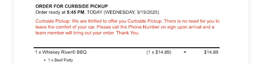 Curbside… arrived 3 min after my scheduled pick up time they were busy with walk in pick ups. Waited patiently 15 min till there was no other people there picking up and saw multiple workers look at me through doors. I look at the confirmation email says call number on sign, no sign no phone number outside. So now I look through the messages and on the website only store number. There’s no direct number to hit to bring you to the curbside pick up so I click employee. I was nice and asked “ is there anyone working curbside I have an order I’ve been waiting for for 15 min and” before i could finish was cut off I was told that “ that’s why it say to call when you get here if you were here 15 min you should have called” and as I was trying to finish to say the automated phone service was takin me back to the main menu when no one picked up the employee line he hung up on me. So not only was his tone rude but his facts are wrong. So when he got to my car I asked him to read what the message said and read it back to me I asked him where the signs were he said there were none I told him he was rude he hung up on me he denied it glad there’s a camera above all this hopefully recorded line too. And after all that the whisky river BBQ sauce was missing on the burger. No reason to be rude to customers cause you can’t handle the busy times of day specially when they were asking a valid question. Don’t bother responding with your sorry auto responses you lost a group...
