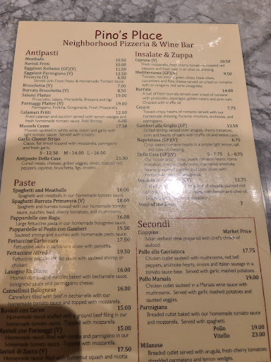 Okay, I am giving 5 stars even though my experience is limited. I went here to meet with a friend/business associate to taste wines. That was the main mission. All were on the "by the glass" menu at Pino's Place. So my experience with the wine list is pretty good. Excellent value wines. Great quality at the price point. Better than average especially since many of the places you would expect to be serving you quality wine, aren't. (Advice for everyone: If you don't see the name or brand of the wine on the menu, don't order it. Move on to something you can at least look up on your phone.)