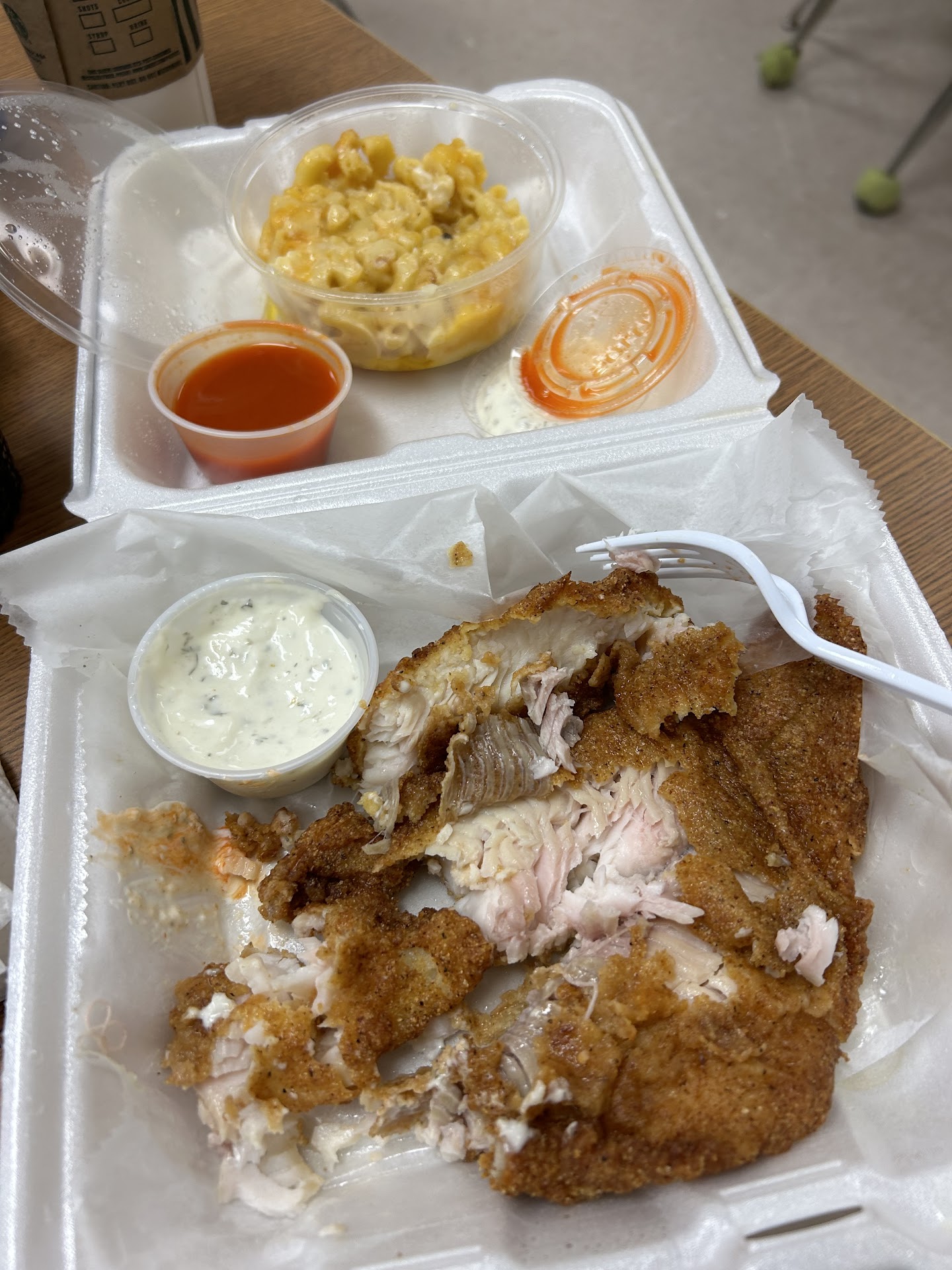 I would say the food has the potential to be amazing, but I think I just got a sloppy meal given to me. There is taste with the catfish here and there. The first piece was okay minus some pink parts, the second piece tastes like rotten fish. The Mac and cheese was so oily and hard, I think I got left overs from the night before.