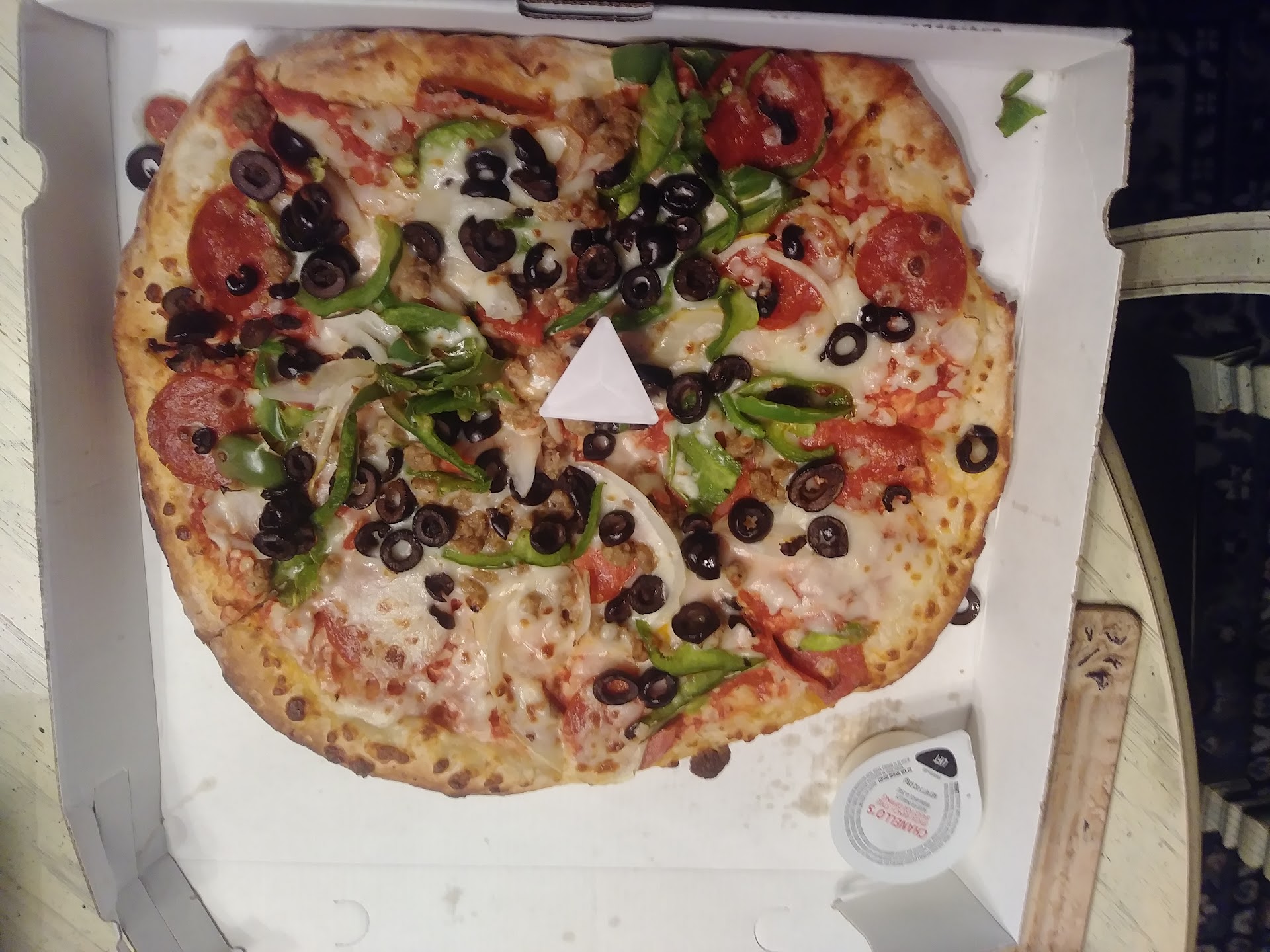 Ordered online received a call from delivery driver to clarify my delivery address. When I informed her that where she was delivering to was a house she informed me she was sitting at a light and could I come outside. Completely baffled as to what she was talking about reiterated that she was delivering to a house. She then asked me if I was upstairs and ok can I just come outside. After standing on my front porch for 4 minutes a car pulls up playing music and 2 young ladies talking loudly. The delivery driver gets out of vehicle dropping things as they laughed about always dropping people's drinks. She then tries explaining herself when pulling up that she had been in the wrong neighborhood. The pizza looked like it had been sliding around somebody's back seat and was cold and raw dough. Stars for her attempt to apologize the asinine behavior and MAINLY because I ordered from them earlier this week and they were awesome delivery and food.