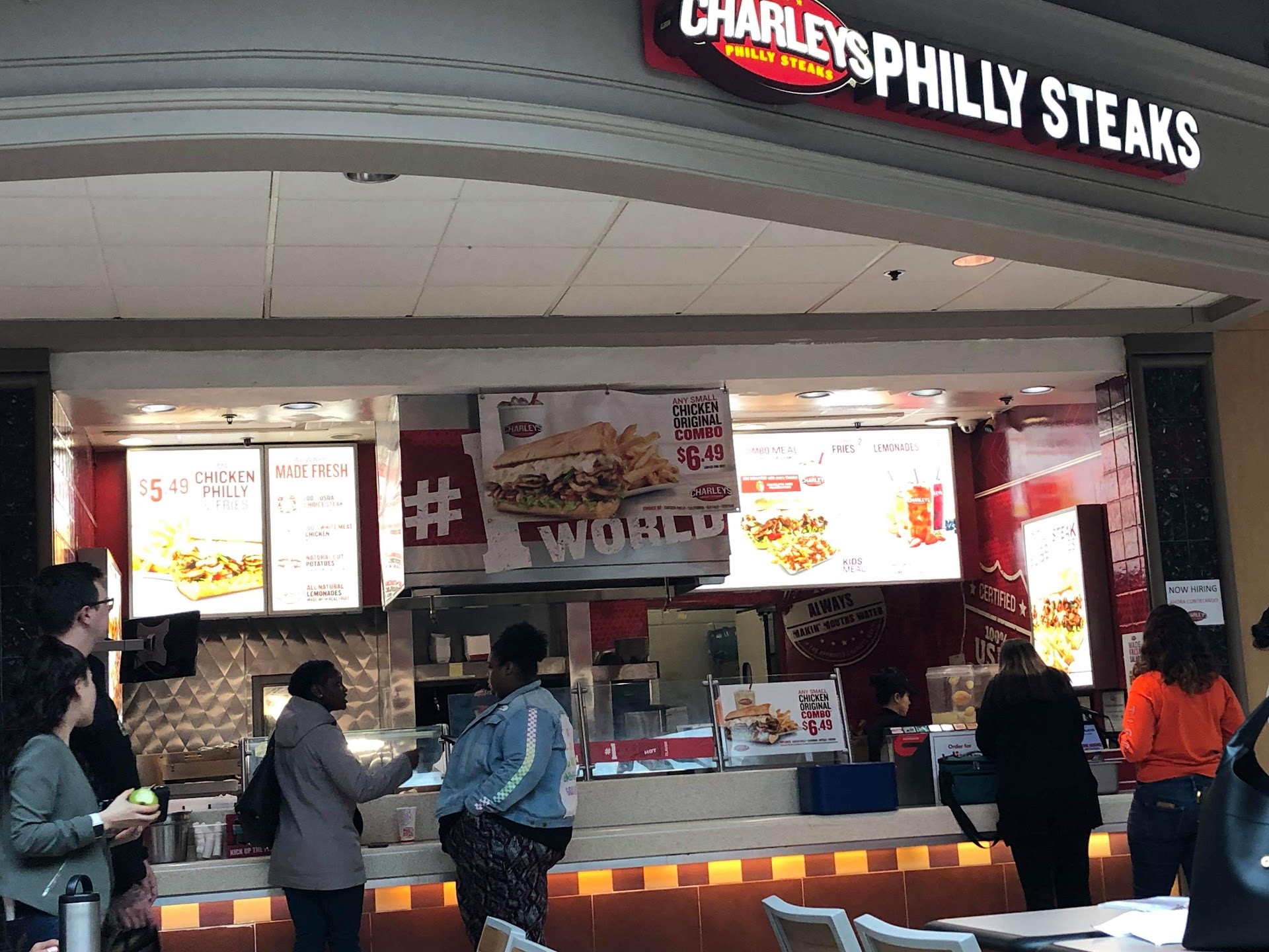 Located in the food court of Greenbrier mall Charley's was overall good but not great. The food was prepared fresh after our order and the staff was polite. I ordered a basic cheese steak with meat and cheese only. It was a good size serving and tasted good but it wasn't great. I like my Philly's well seasoned and this one was just average. I did like that you could add fries though, because I'm tired of all sub shops only serving chips. They also give you the punch card where you get your 8th sandwich free so I wouldn't...