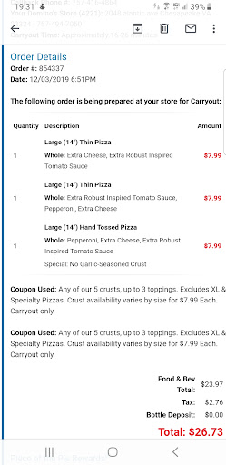 Read moreI have been struggling with leaving this review for several days. I HATE leaving negative reviews. I love Domino's and I work late hours, so I order delivery pizza more than I should! This location has had the occasional mishap: overcooked food, cold food, missing dipping cup, annoyed team member on the phone when you call about the error. I can deal with this, ish happens, but I ordered earlier this month and it was honestly the last straw. I got home later than normal and decided to order pizza bc I didn't have the energy to make something. I placed my order through the app at 11:20. At 11:33, the pizza tracker said my food was out of the oven. By 12:35, I still hadn't recieved it. I was trying to call the store to cancel the order, because, at that point, I just wanted to go to bed. I got the automated system and waited on hold for a full 10 minutes, but no one would answer. Resigned to having to stay up and wait for this, I hung up. At 12:47, pizza tracker said the order was finally out for delivery. At 1 a.m., it finally arrived, almost 2 hours after I placed the order. I said to the driver, "wow, you guys are busy tonight!" He just stared at me, confused, and then said, kind of slowly "uh, yea." Once I got the food inside, it was, of course, stone cold. I have had so many issues with this location that my "insurance" through the app no longer works. It just says, "we are sorry you have had so many issues with your order. Please contact the store at.." . So, I will no longer be ordering from this location, and, if you choose to, just be warned. Forewarned is forearmed,...