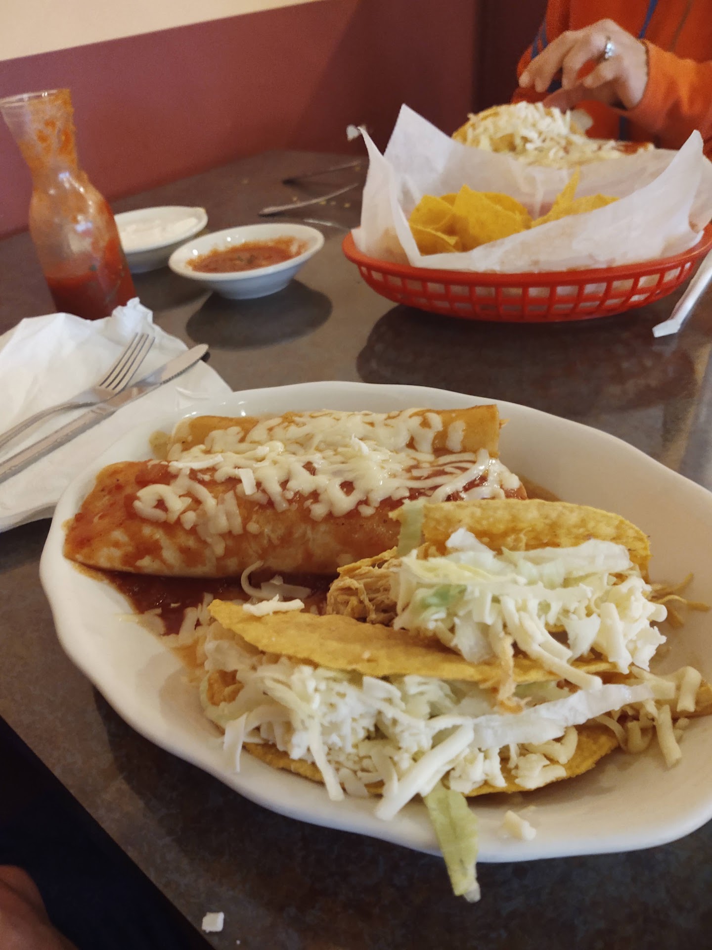 Ā Ā Ā Read moreThere was a short wait for the two of us. The atmosphere was standard authentic Mexican with not so comfortable bench seats for our booth. The chips and salsa were fantastic! Hearty chips, well balanced salsa with plenty of cilantro and onions. My wife likes a runnier salsa and I like it thick. It was balanced enough to accommodate us both in that I took big chunks and she could get the liquid stuff left over. They did provide a white sauce too, but I don't like that stuff anywhere I eat Mexican, so no further comment! I ordered a number 7 which was a burrito, enchilada, and two tacos. The tacos were great! Hearty shells that didn't break down even soaked in the ranchero sauce. The burrito and enchilada were meh. Just a tortilla filled with chicken. No rice or beans. The sauce was ok and it was topped with cheese. The food showed up super fast, but they were slow on the check.