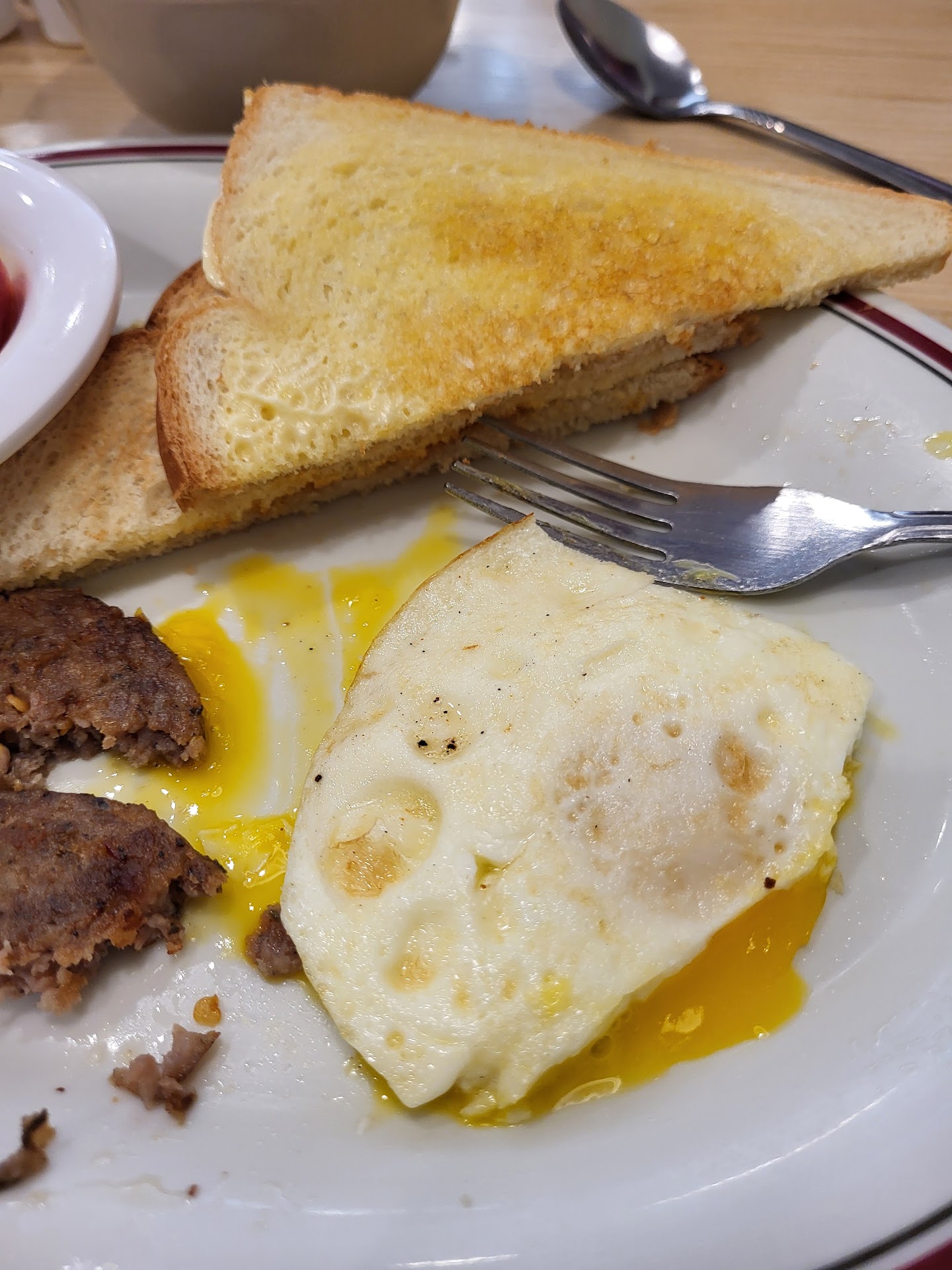 The single woman across from us, had a simple breakfast of 2 sausage Patties, eggs, toast, seasonal fruit, and maybe grits.