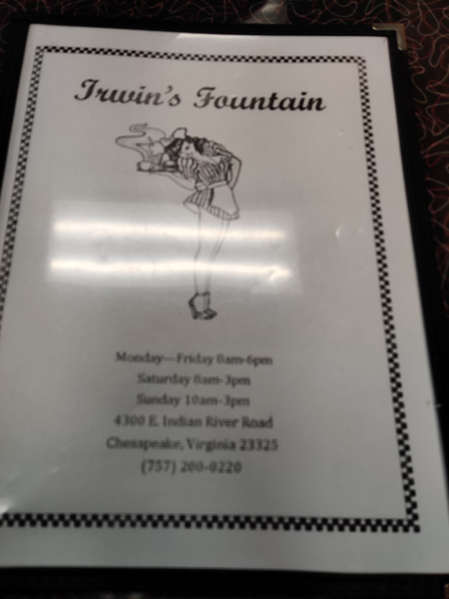Read moreI have not lived near Chesapeake, Va. for a long time, my wife (Julie) and I live in South Carolina and went to Maryland to visit one of our children and grandchildren, on the way home I told Julie I wanted to go to where I lived when I was 13, I am now 70. When we came to the corner of Sparrow Road and Indian River Road I could not believe Irwin's Fountain was still there. I shared one of my favorite memories with Julie which was I would get off the school bus before it got to my stop, go in Irwin's Fountain and get a limeade made with real limes and a pack of Hostess Twinkies that I paid for with my newspaper route money, the lady behind the counter was always so nice to me. I went down Sparrow Road and saw the house we lived in then went to the cathole pond and told Julie another story about one winter it froze over and some girls were walking on the ice when the ice broke and one of them fell into the water and could not get out so I found a long stick and pulled her out, her grandmother put the story in the newspaper. I had never told Julie either of those stories. When driving back down Sparrow Road I had to stop at Irwin's Fountain, I sat at the counter in the same spot I sat at in 1967, it was breakfast time so we ate and the food was very good. I did not want to leave, I wanted to be 13 again, it brought back such great memories. Thank You Irwin's Fountain. Sincerely,...